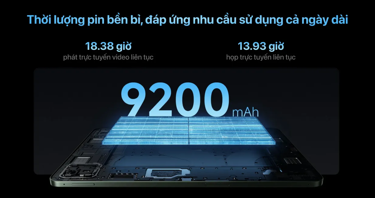 Máy tính bảng Xiaomi Pad 8 Pro cung cấp thời gian hoạt động lâu dài nhờ viên pin dung lượng lớn 9200mAh. Dung lượng này đủ để đáp ứng nhu cầu sử dụng cường độ cao từ việc xem video, lướt web đến xử lý tài liệu liên tục. Sự kết hợp giữa dung lượng pin lớn và vi xử lý tiết kiệm điện năng tạo nên sự an tâm cho người dùng.