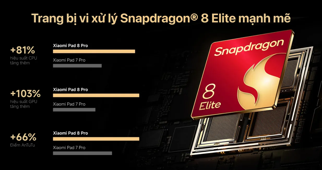 Việc tích hợp vi xử lý Snapdragon 8 Elite trên tiến trình 3nm giúp máy tính bảng Xiaomi Pad 8 Pro duy trì tốc độ phản hồi nhanh chóng. Chipset này bao gồm 8 nhân với hai nhân hiệu năng cao đạt xung nhịp 4.32 GHz kết hợp cùng GPU Adreno mạnh mẽ giúp xử lý mượt mà các ứng dụng đồ họa nặng.