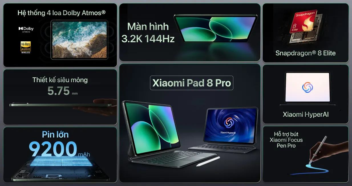 Máy tính bảng Xiaomi Pad 8 Pro sử dụng vi xử lý Snapdragon 8 Elite mạnh mẽ trên tiến trình 3nm giúp người dùng xử lý nhanh chóng mọi tác vụ công việc. Máy được trang bị pin dung lượng 9200mAh giúp máy vận hành liên tục. Tần số quét 144Hz kết hợp cùng độ phân giải 3.2K giúp tăng cường độ sắc nét và sự mượt mà khi hiển thị.