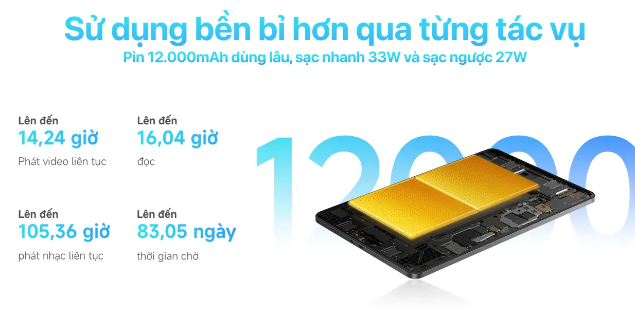 Máy tính bảng Xiaomi Redmi Pad 2 Pro được trang bị viên pin dung lượng khủng 12.000mAh, có thể hoạt động bền bỉ suốt cả ngày dài. Với dung lượng pin ấn tượng này, người dùng có thể thoải mái xem phim 14.2 giờ, đọc sách 16 giờ, phát nhạc liên tục 105 giờ và duy trì thời gian chờ đến 83 ngày.