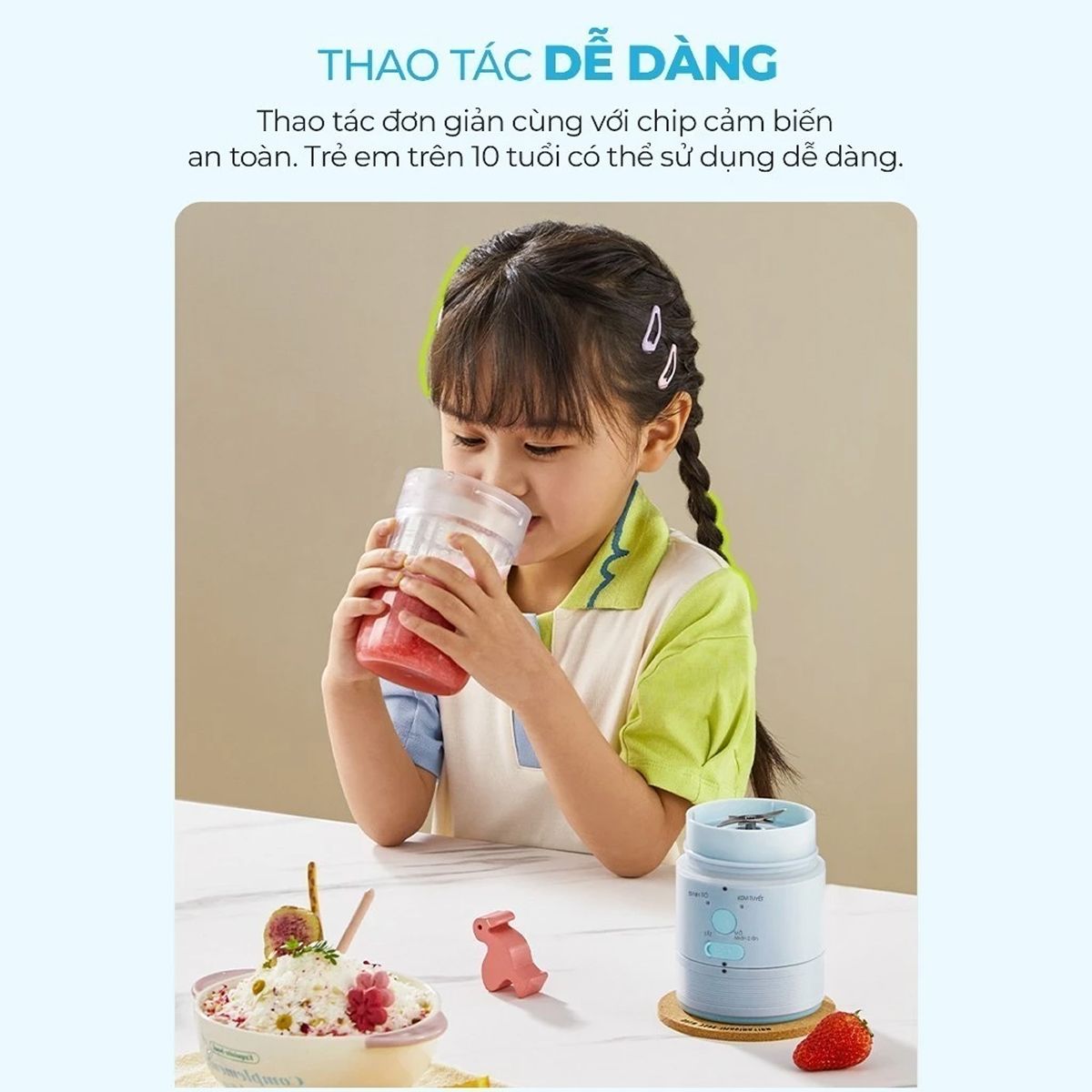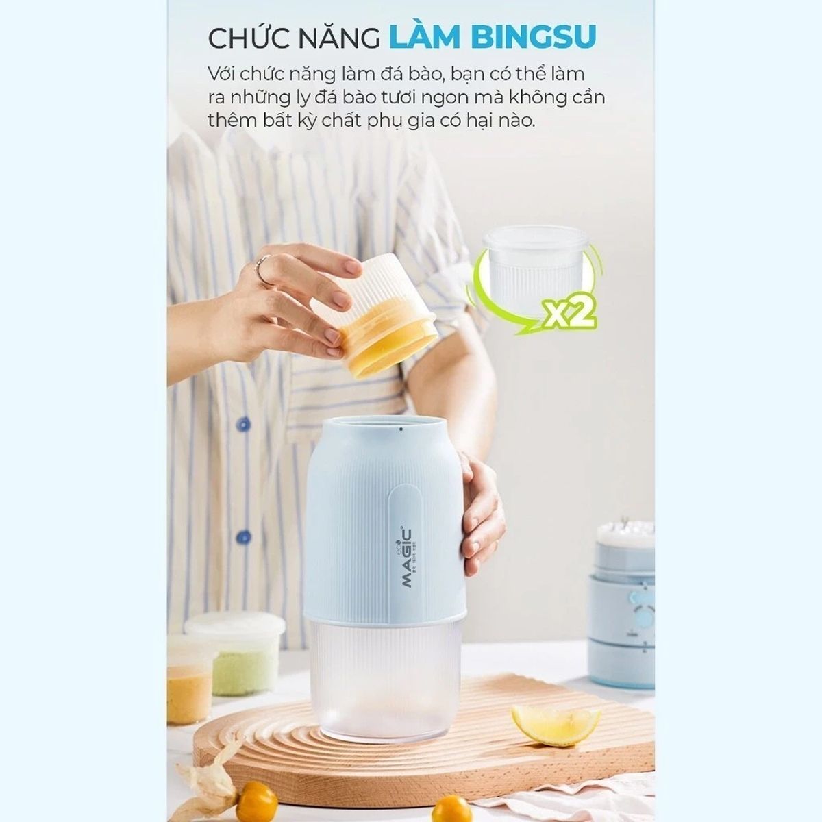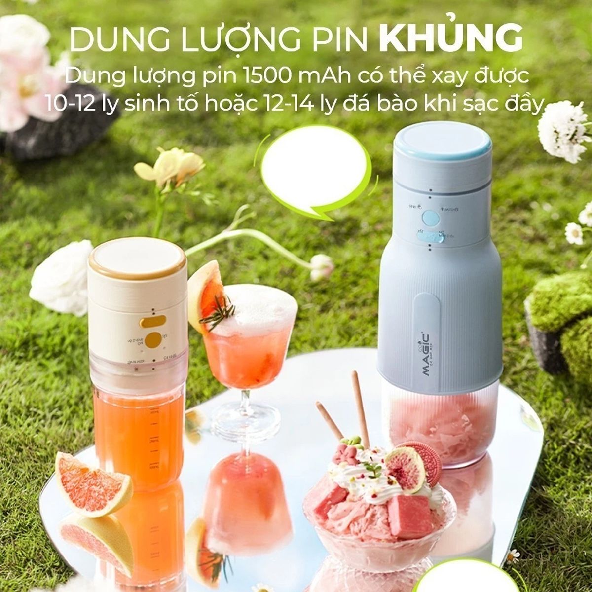 Với dung tích bình sinh tố 480ml và cốc đựng kem 580ml, sản phẩm đáp ứng đầy đủ khẩu phần cho nhiều thành viên. Thiết kế đa năng không chỉ mang lại sự tiện lợi mà còn mở ra không gian sáng tạo vô tận cho các công thức đồ uống và món tráng miệng. Đây thực sự là một trợ thủ đắc lực giúp làm phong phú thêm thực đơn giải khát hàng ngày.