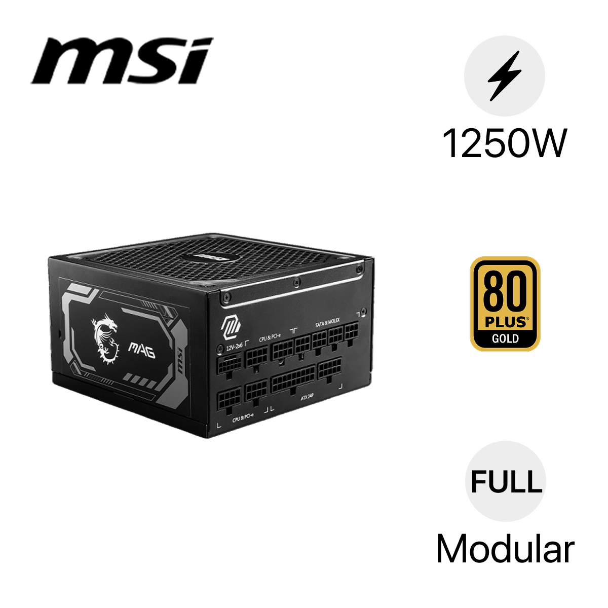 Nguồn máy tính MSI MAG A1250GL PCIE5 1250W sở hữu mức công suất danh định khổng lồ 1250W. Con số này cho phép người dùng xây dựng hệ thống cấu hình máy khủng. Người dùng có thể chạy song song các linh kiện tốn nhiều năng lượng đến các hệ thống workstation chuyên dụng.