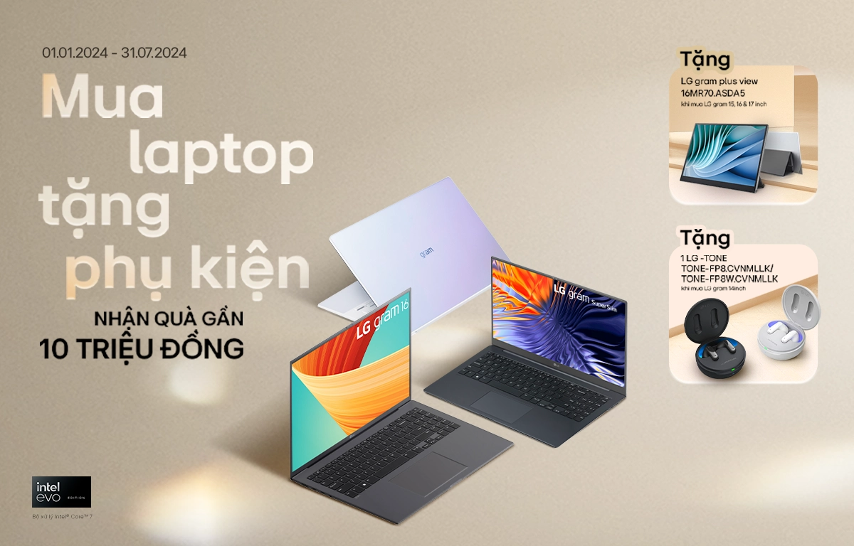Chương trình diễn ra từ ngày 01/01 - 31/07/2024, khi mua hoặc lên đời Laptop LG gram 2023, người dùng sẽ được tặng ngay một chiếc tai nghe LG TONE Free FP8 trị giá hơn 4 triệu hoặc một chiếc màn hình di động LG gram +view 16 inch trị giá gần 10 triệu đồng.