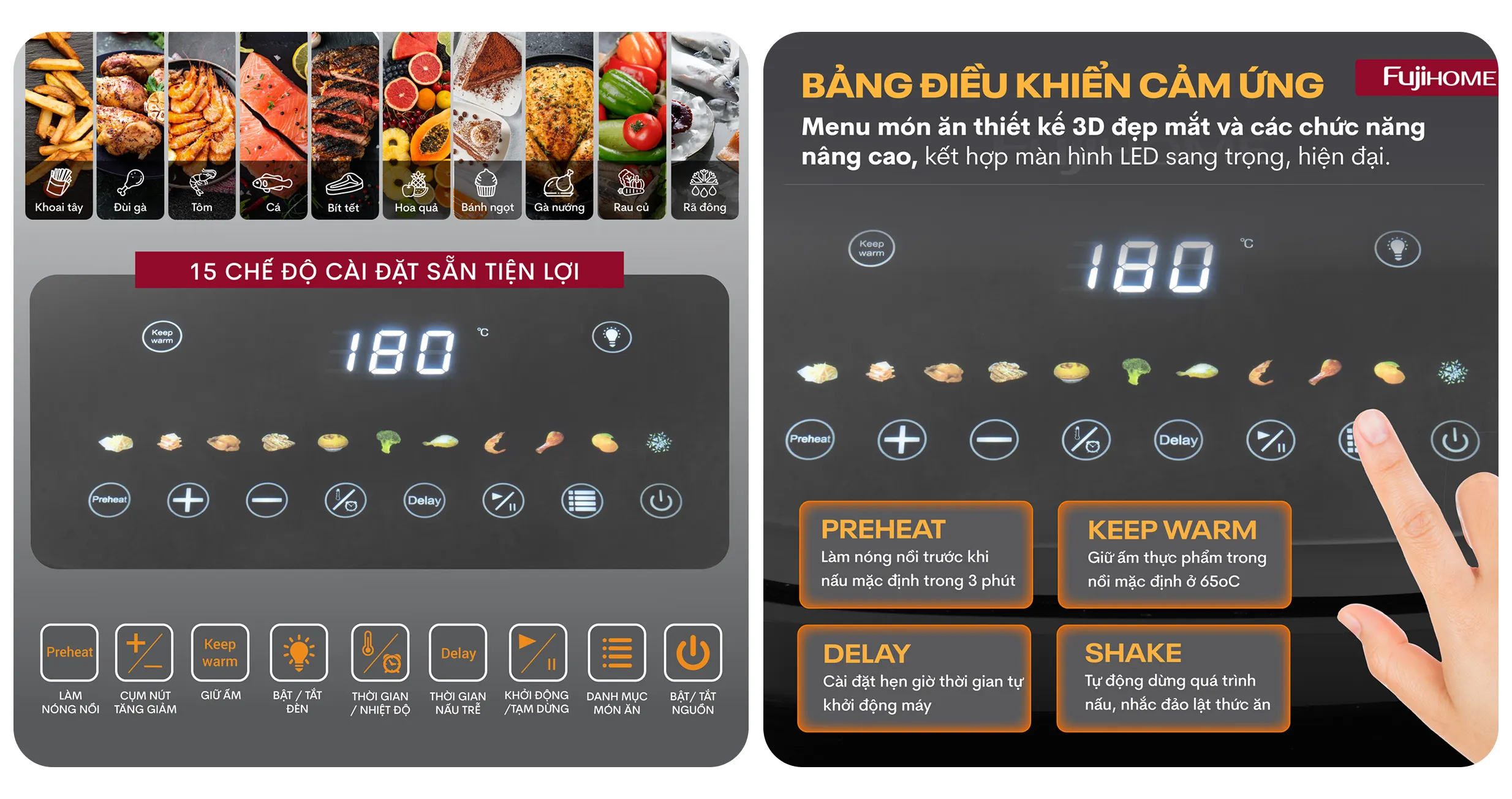 Nồi chiên không dầu Fujihome A8DG1 8L tích hợp 11 chế độ nấu được lập trình sẵn, hỗ trợ chế biến nhiều món ăn. Tất cả đều thao tác dễ dàng qua màn hình cảm ứng LED trực quan.