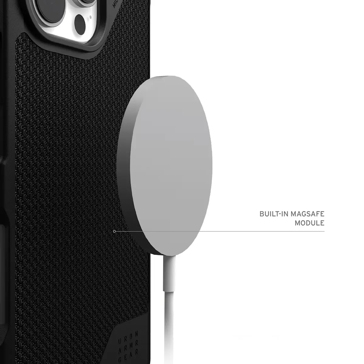 Ốp lưng iPhone 16 Pro UAG Metropolis LT With MagSafe Kevlar được thiết kế đặc biệt để tối ưu hóa trải nghiệm sạc không dây. Điểm mấu chốt là mô-đun nam châm mạnh mẽ tích hợp bên trong ốp.