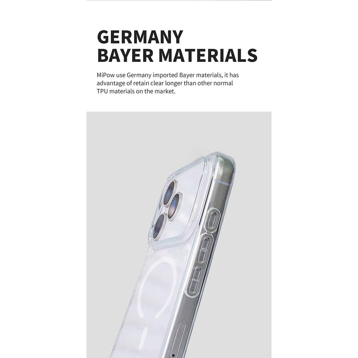 Vật liệu Bayer chất lượng cao từ Đức được lựa chọn để sản xuất viền ốp lưng, vượt trội về khả năng duy trì độ trong suốt so với các loại nhựa thông thường kết hợp kính cường lực. Công nghệ phủ kháng oxy hóa ngăn cản quá trình biến đổi màu sắc của ốp lưng iPhone 17 Pro Max Mipow Button Control Tempered Glass With Magsafe Transparent trong suốt.