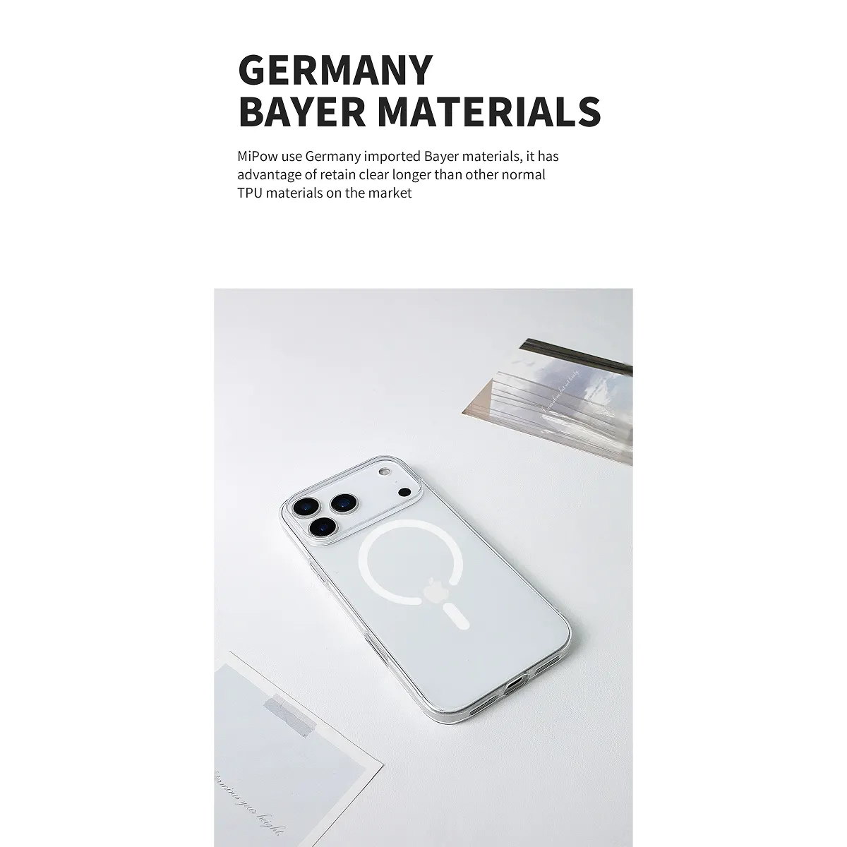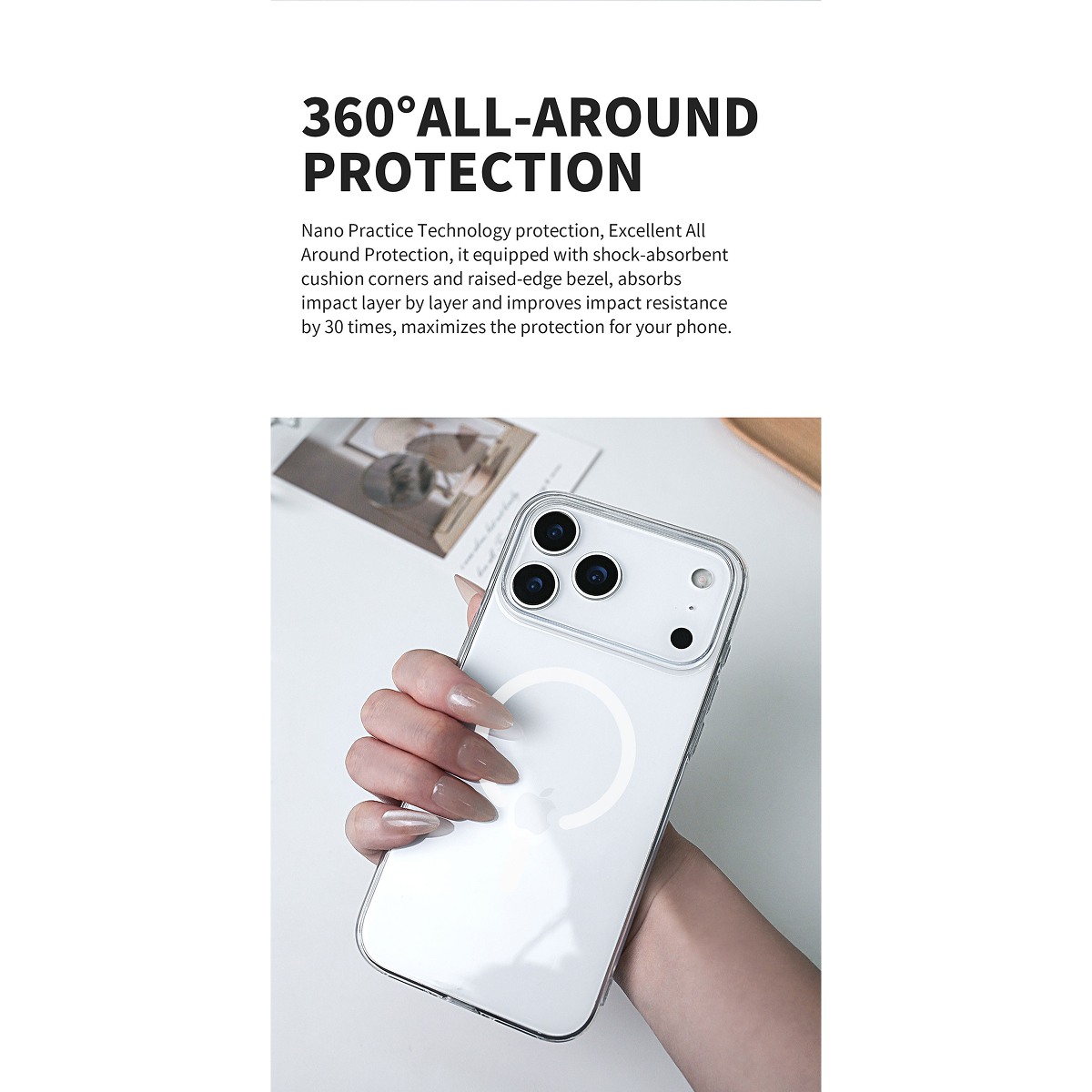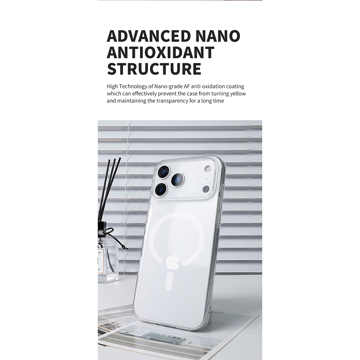 Ốp lưng iPhone 17 Pro Max Mipow Tempered Glass with Magsafe trong suốt sử dụng viền TPU Bayer Đức, mặt lưng kính cường lực, hỗ trợ sạc MagSafe, chống sốc tối đa. Sản phẩm ốp lưng Mipow iPhone 17 Series trang bị lớp phủ chống oxy hóa Nano AF, công nghệ Nano Practice hấp thụ lực. Thiết kế mỏng nhẹ, viền nhô cao bảo vệ camera và màn hình, trong suốt hạn chế ố vàng cho điện thoại.