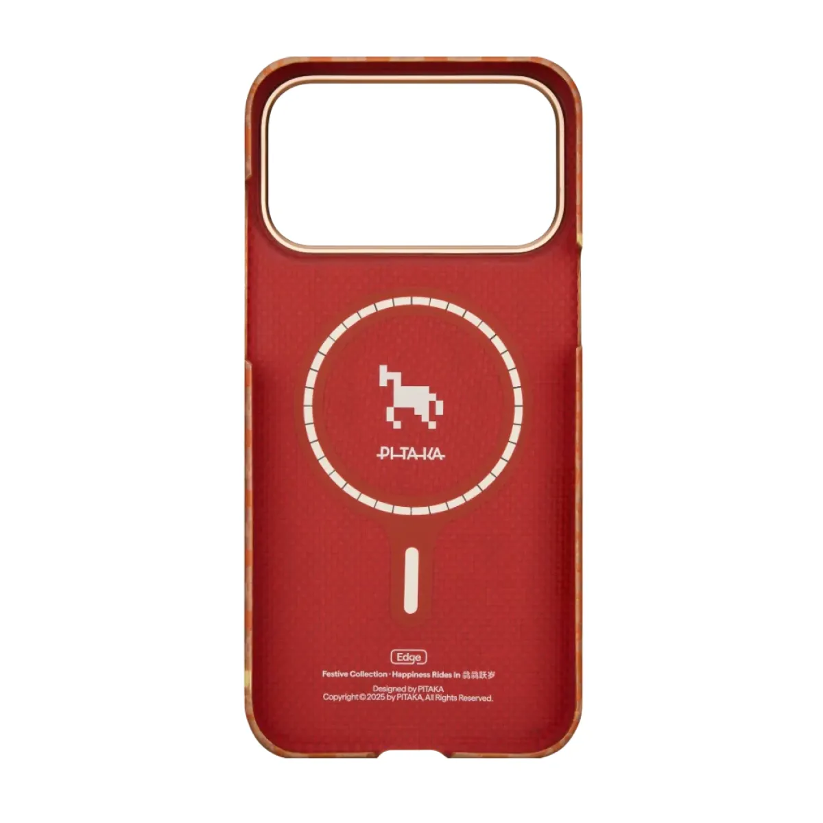 Ốp lưng iPhone 17 Pro Max Pitaka Edge Happiness Rides In sở hữu cấu trúc dệt ba lớp, tạo nên hiệu ứng thị giác có chiều sâu với họa tiết ngựa chuyển động. Tông màu nổi bật phù hợp với phong cách hiện đại và cá tính.