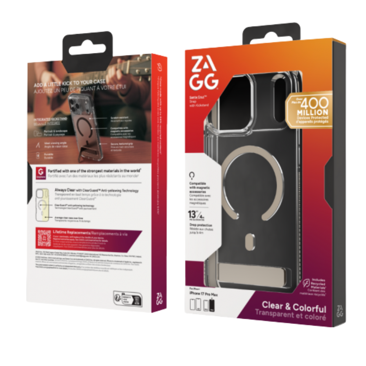 Ốp lưng iPhone 17 Pro ZAGG Santa Cruz Snap Kickstand sở hữu viền màu nổi bật, tạo điểm nhấn thẩm mỹ rõ ràng mà vẫn giữ được phong cách hiện đại. Lớp lưng trong suốt ứng dụng công nghệ ClearGuard giúp giảm tình trạng ố màu, giữ cho ốp luôn bền đẹp.