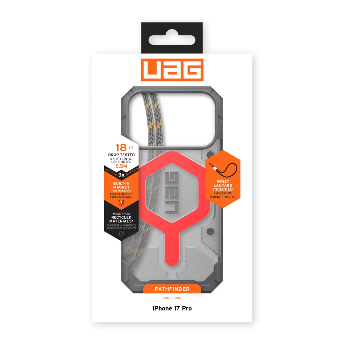 Ốp lưng kèm dây đeo iPhone 17 Pro Max UAG Pathfinder Clear With MagSafe đem đến khả năng bảo vệ vượt trội cho mặt lưng và 4 góc máy. Mẫu ốp này còn cho phép hạn chế hư hỏng và giảm trầy xước khi rơi từ độ cao lên đến 18ft (5.4m).