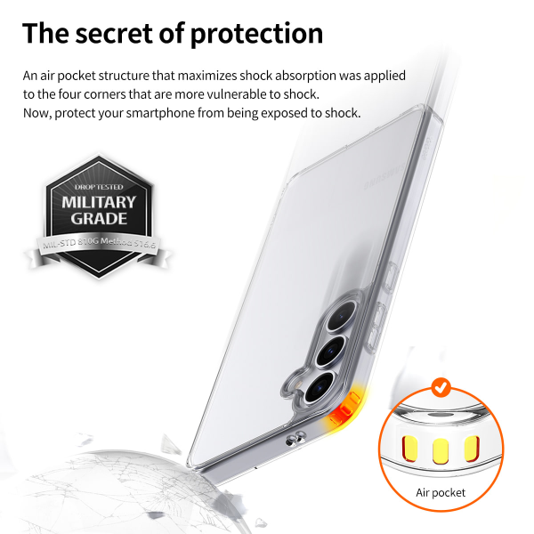 Ốp lưng Samsung Galaxy S24 Plus Araree Duple Clear mang đến khả năng chống va đập mạnh mẽ nhờ đạt chuẩn thử nghiệm rơi rớt theo tiêu chuẩn quân đội (MIL-STD-810G). Sản phẩm này còn trang bị cấu trúc túi khí được thiết kế tại bốn góc. Nhờ vậy, lực va chạm sẽ được phân bổ đều, giúp bảo vệ điện thoại hiệu quả trong quá trình sử dụng hàng ngày.