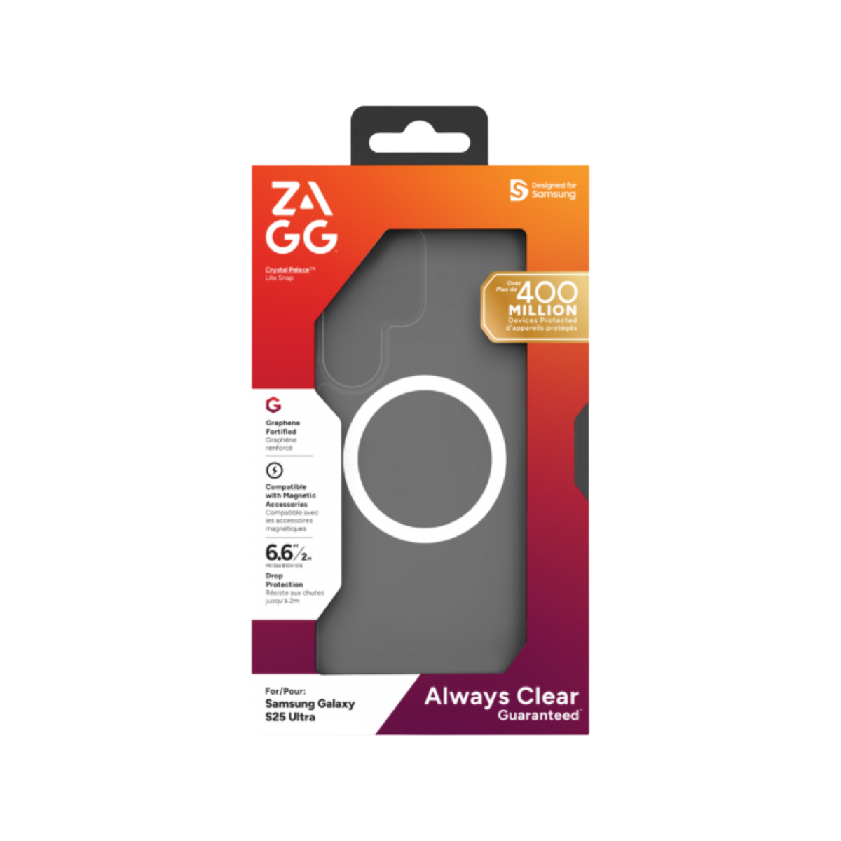 Ốp lưng Samsung Galaxy S25 Zagg Crystal Palace Lite With MagSafe mang đến lớp bảo vệ mạnh mẽ từ kết cấu Graphene cứng cáp. Cấu trúc ốp được thiết kế để phân tán lực tác động, góp phần bảo vệ thân máy hiệu quả mà không làm tăng độ cồng kềnh.