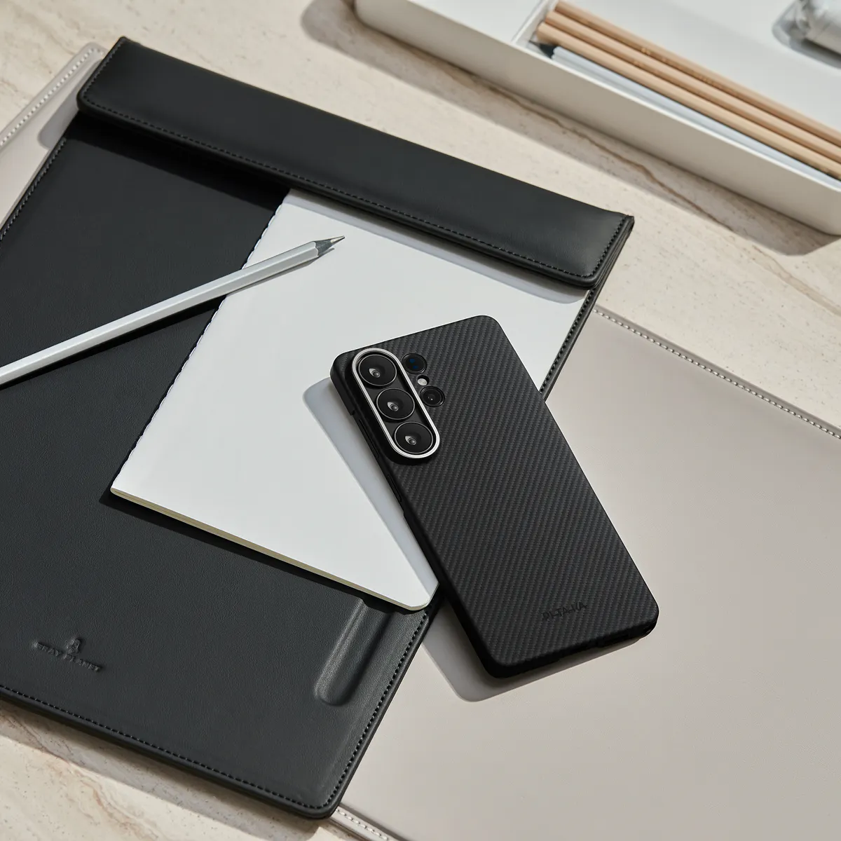 Ốp lưng Samsung Galaxy S26 Ultra Pitaka Edge Case được chế tác từ sợi Aramid chuẩn hàng không vũ trụ có độ dày 1.2mm và trọng lượng chỉ khoảng 25g. Ốp hỗ trợ MagSafe và tích hợp Aaron Button tùy chỉnh nhanh tác vụ. Thiết kế viền ốp lưng Samsung Galaxy S26 Series nâng bảo vệ màn hình và cụm camera, tương thích tốt với dòng Galaxy S26 Ultra.