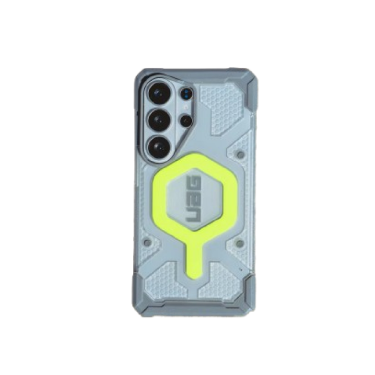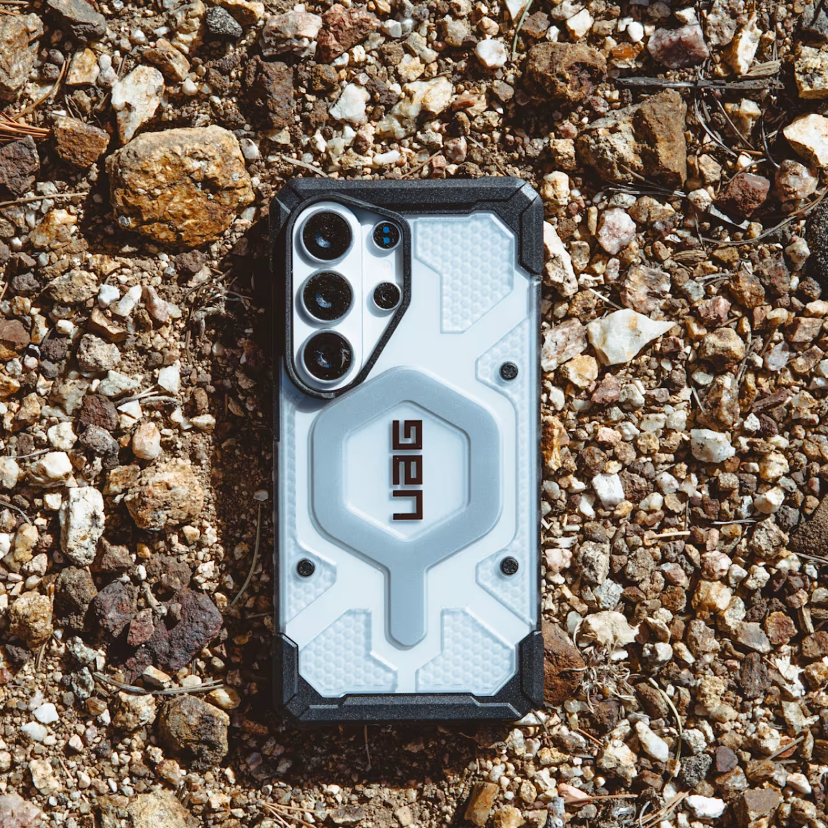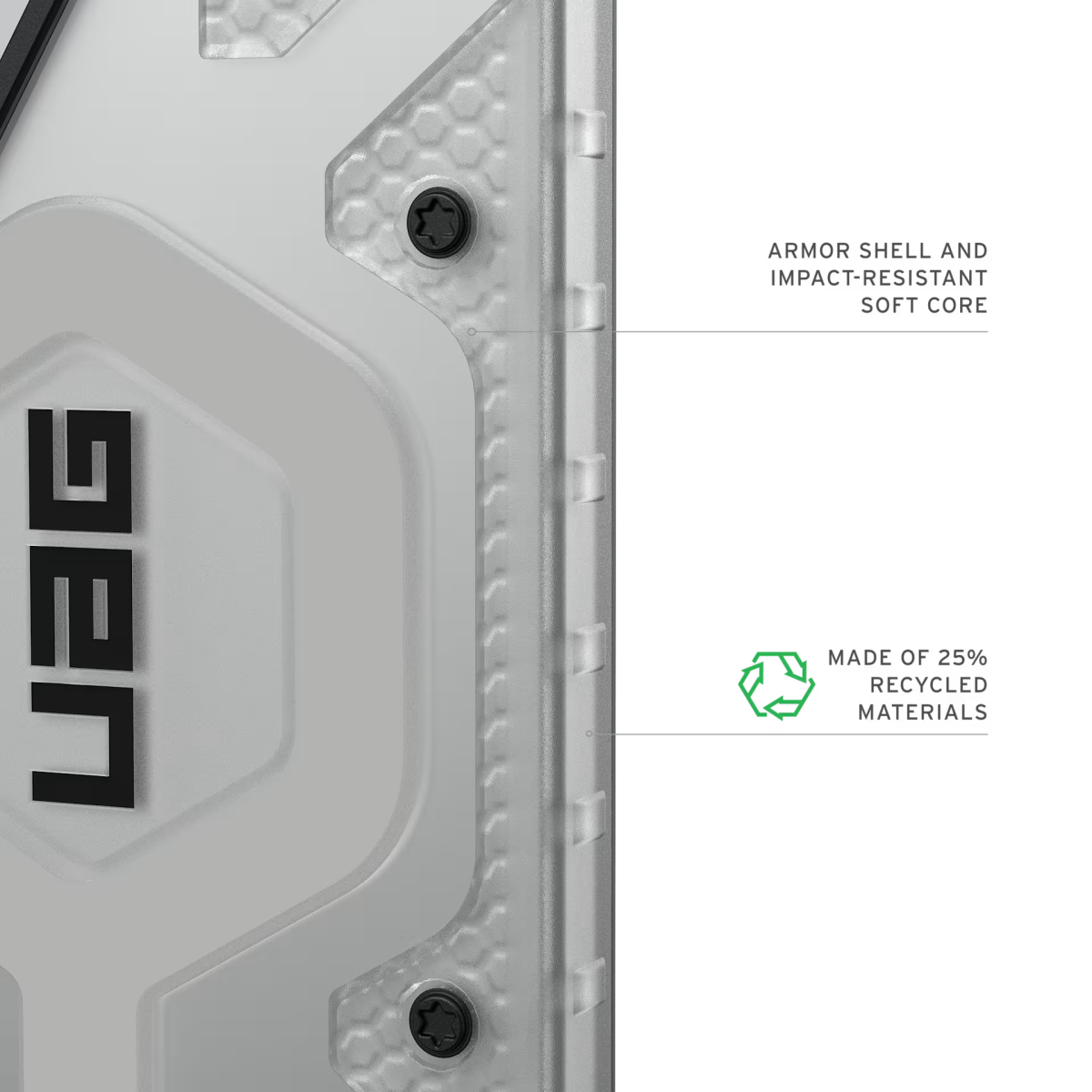 Sản phẩm ốp S26 Ultra UAG Pathfinder Clear with MagSafe sở hữu khung giảm chấn kết hợp lõi họa tiết lục giác nhằm hỗ trợ phân tán lực tác động khi rơi. Viền quanh màn hình được làm nhô cao so với bề mặt kính, kết hợp các cạnh TPU tăng cường nhằm giảm thiểu hư hại ở 4 góc. Khoảng 1/4 cấu trúc vật liệu được tạo nên từ vật liệu tái chế, góp phần giảm thiểu rác thải.