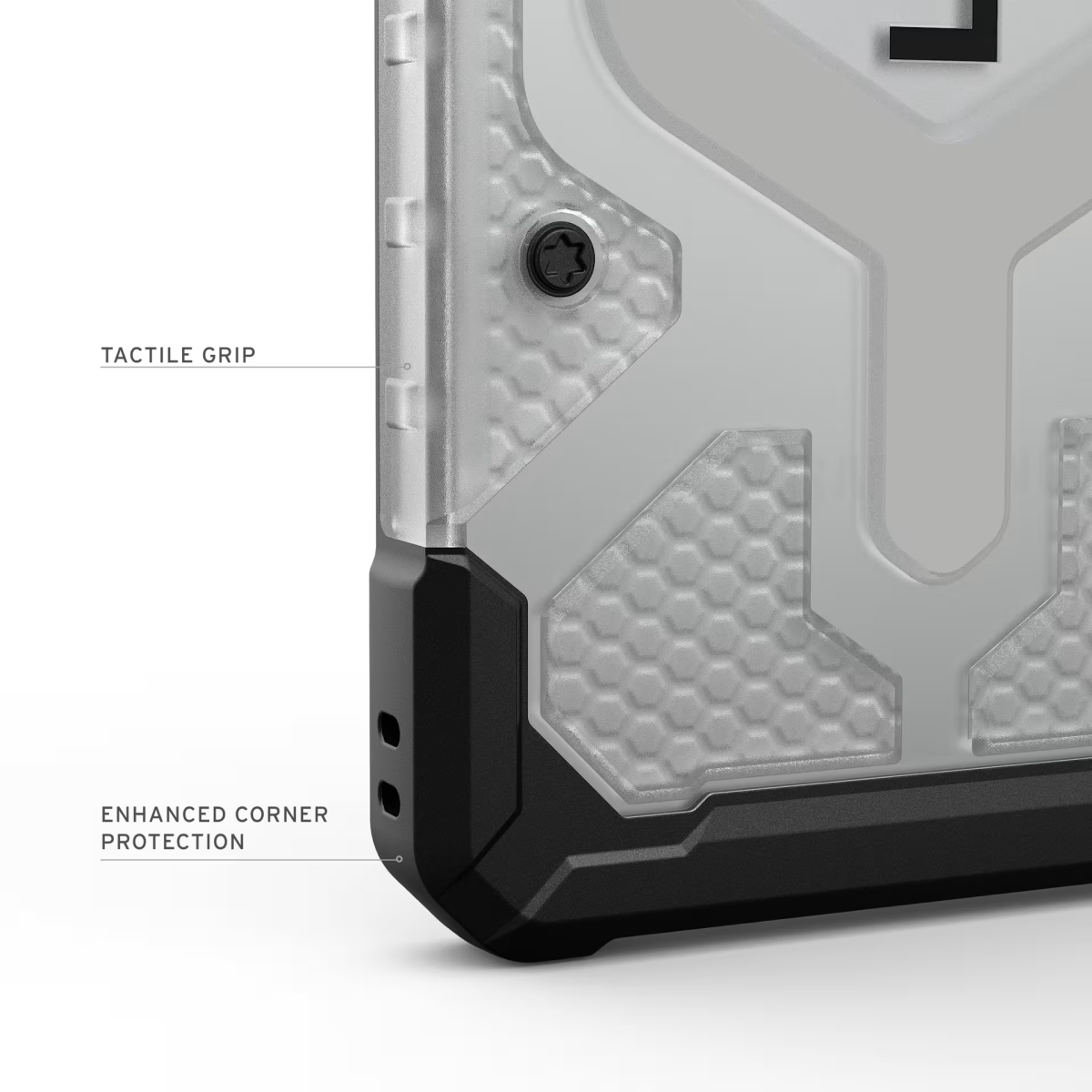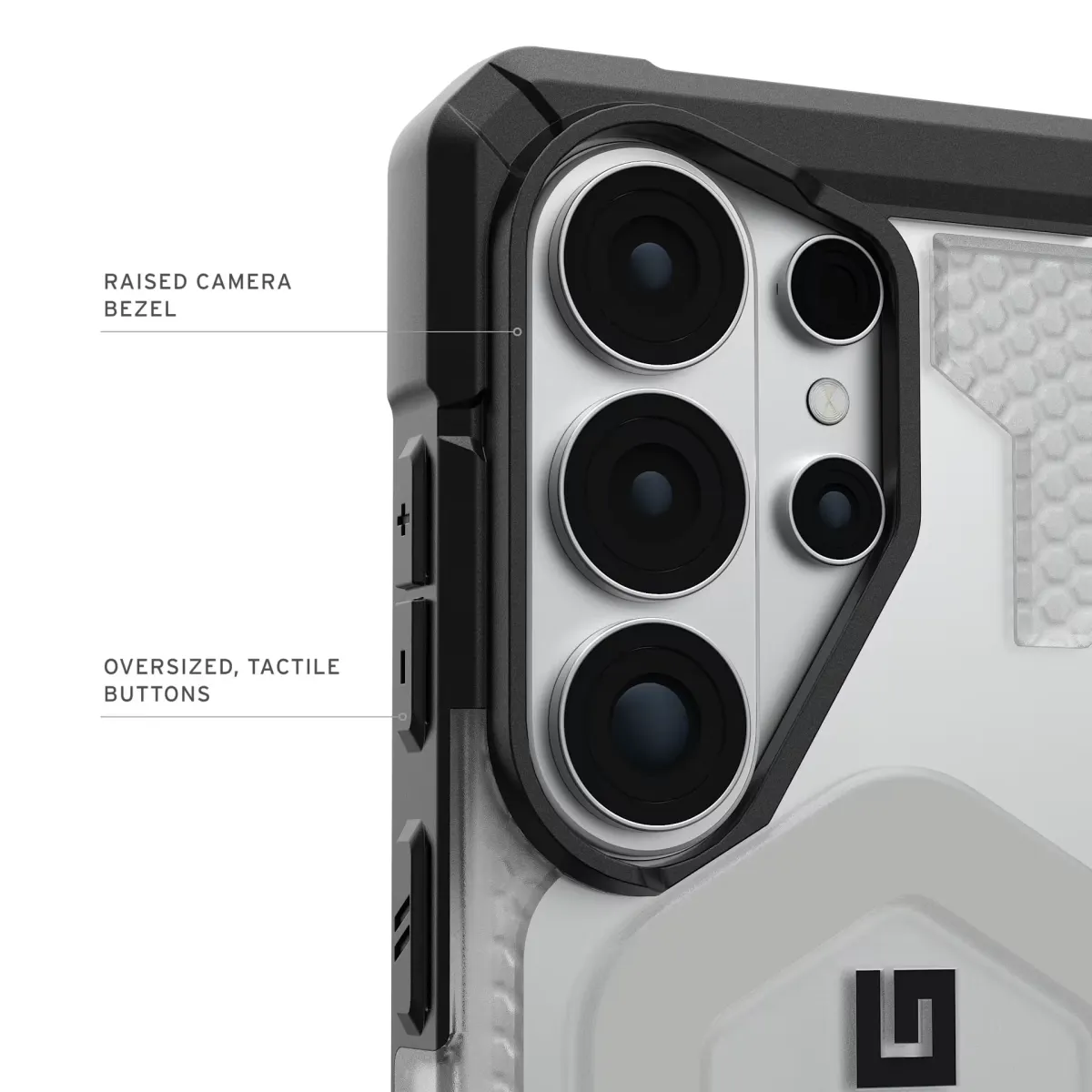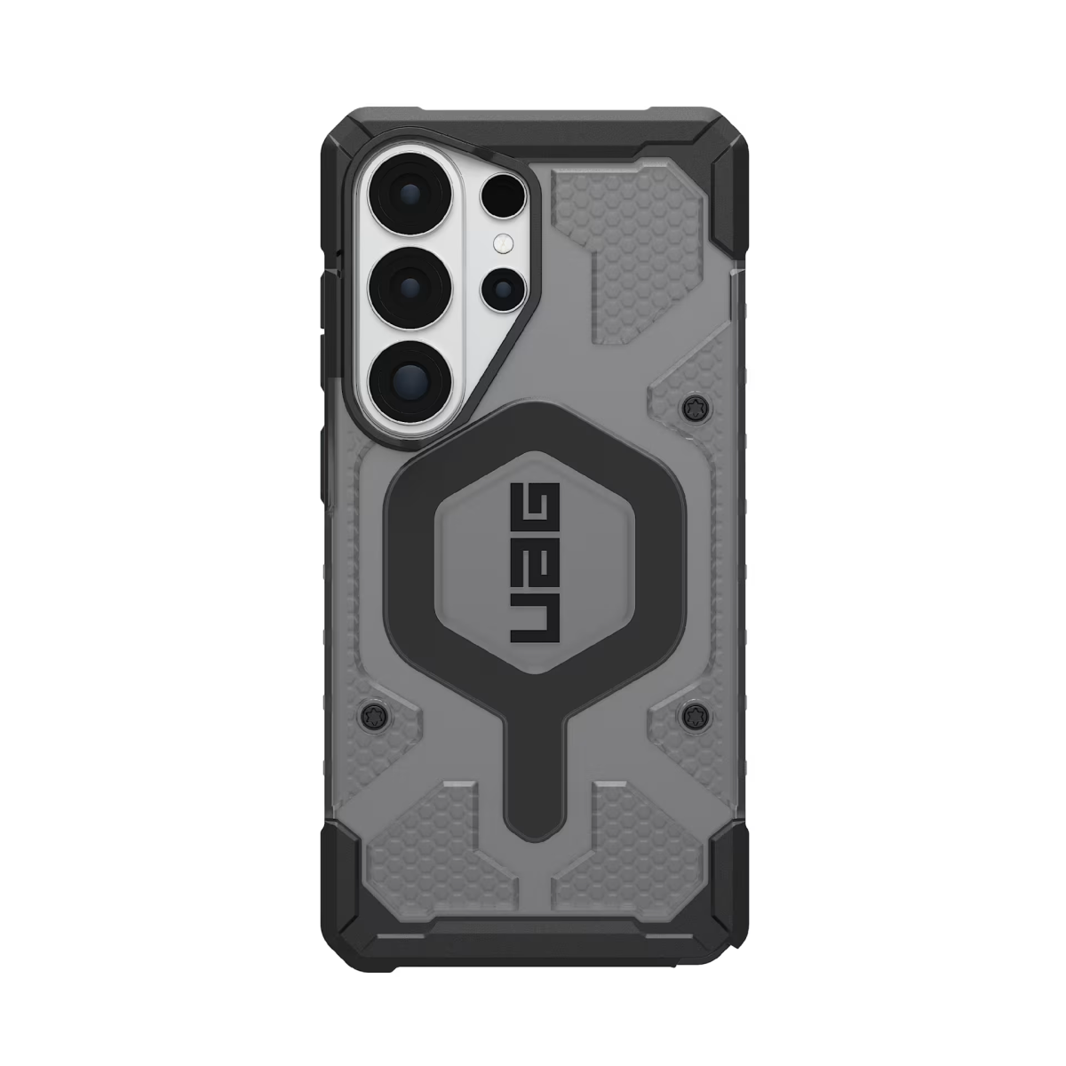 Sản phẩm ốp S26 Ultra UAG Pathfinder Clear with MagSafe sở hữu khung giảm chấn kết hợp lõi họa tiết lục giác nhằm hỗ trợ phân tán lực tác động khi rơi. Viền quanh màn hình được làm nhô cao so với bề mặt kính, kết hợp các cạnh TPU tăng cường nhằm giảm thiểu hư hại ở 4 góc. Khoảng 1/4 cấu trúc vật liệu được tạo nên từ vật liệu tái chế, góp phần giảm thiểu rác thải.