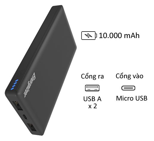 Giảm 500K khi thanh toán bằng thẻ tín dụng HDBankNhững chiếc smartphone mà bạn thường dùng có một điểm yếu khá lớn: thời lượng pin thấp. Điều này có thể ảnh hưởng đến việc sử dụng điện thoại của bạn, đặc biệt là khi đi bạn đi ngoài đường, đi chơi xa, đi du lịch,... Giải pháp tốt nhất để khắc phục điểm yếu trên là trang bị cho mình một chiếc pin dự phòng. Mới đây, Energizer vừa cho ra mắt dòng pin dự phòng Energizer 10000mAh UE10033. Với dung lượng pin lớn, kích cỡ nhỏ gọn, độ an toàn khi sử dụng cao, đây hứa hẹn sẽ là sự lựa chọn hoàn hảo cho những người dùng đang có nhu cầu về pin dự phòng.
