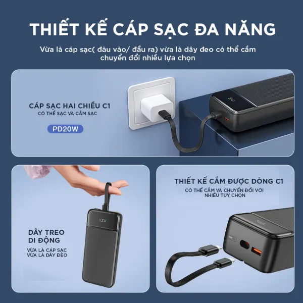 Với dung lượng pin lên đến 20000mAh, sản phẩm mang đến nguồn năng lượng dự trữ dồi dào. Nhờ đó, người dùng có thể cung cấp pin cho điện thoại, máy tính bảng,... nhiều lần liên tiếp trong ngày mà không cần nạp lại pin cho sạc dự phòng thường xuyên.