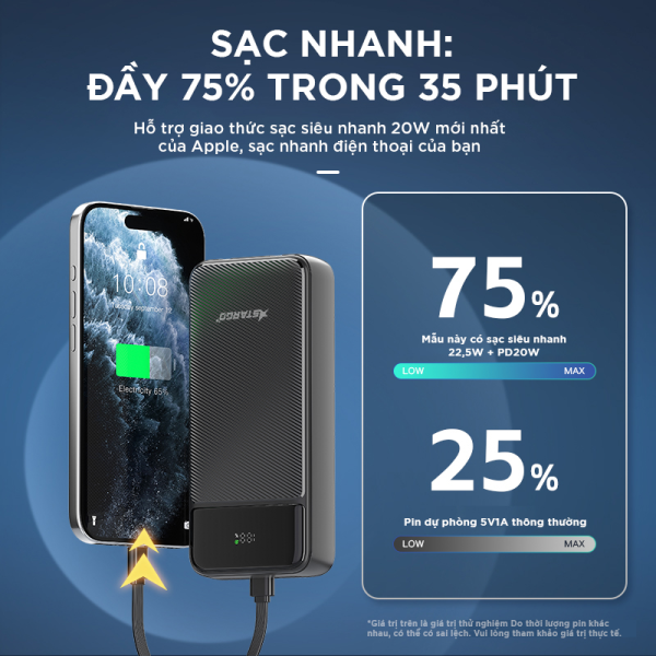 Pin sạc dự phòng StarGO Gem Power 20000mAh 22.5W sở hữu dung lượng pin lớn, giúp người dùng sạc đầy năng lượng cho nhiều thiết bị ở mọi lúc, mọi nơi. Sở hữu công suất 22.5W Power Delivery, phụ kiện pin dự phòng StarGO mang đến trải nghiệm sạc tốc độ và tiện lợi cho người dùng. Với nhiều lớp bảo vệ, pin tránh phát sinh rủi ro, sự cố khi sử dụng.