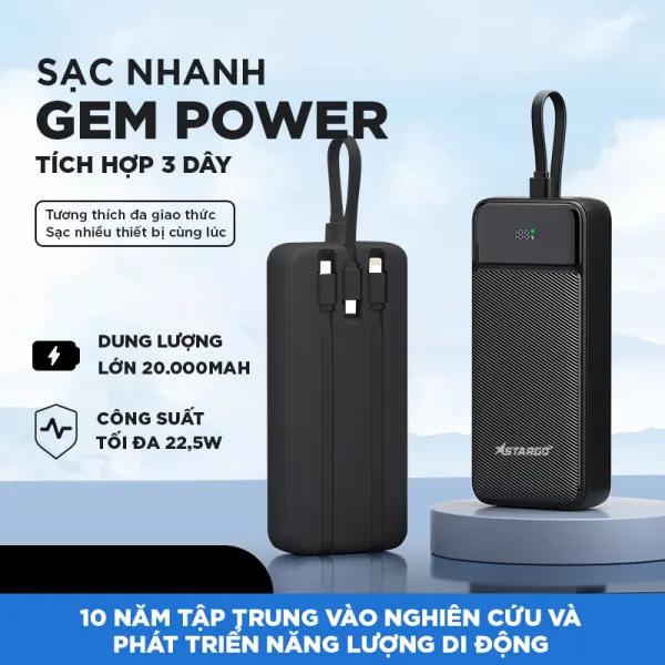 Pin dự phòng StarGO Gem Power 20000mAh 22.5W tích hợp cáp 2C+1L