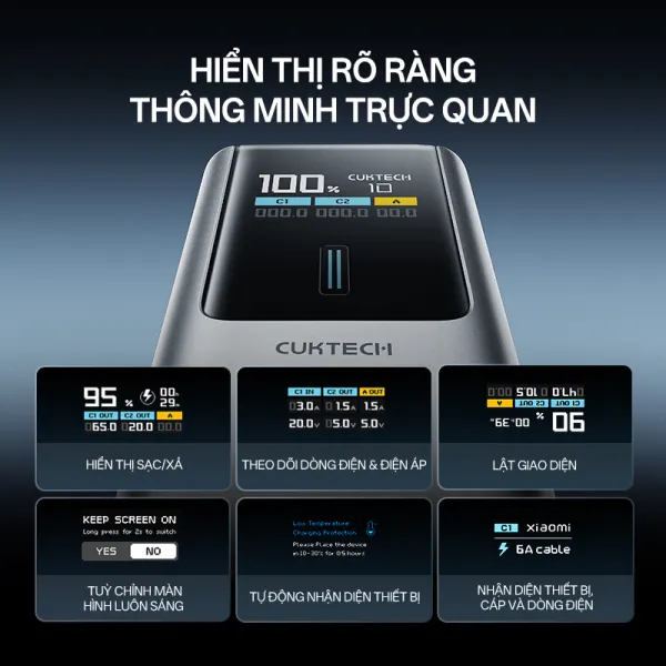 Tổng công suất sạc đầu ra có thể đạt đến 120W, đáp ứng nhu cầu sạc nhanh, tiết kiệm đáng kể thời gian nạp pin. Không chỉ vậy, thiết bị còn hỗ trợ nhiều chuẩn sạc hiện đại như PD, PPS, QC FCP, SCP, UFCS,... giúp đảm bảo khả năng tối ưu hóa tốc độ cho từng loại thiết bị.
