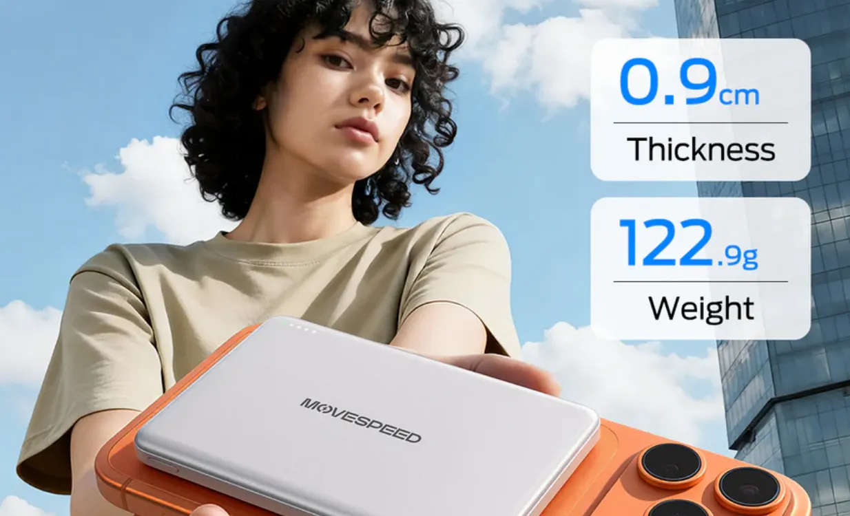 Sạc sở hữu một thiết kế tối ưu với trọng lượng chỉ 122.9g và kích thước siêu mỏng 0.9cm. Con số vừa phải này cho phép pin dự phòng Movespeed giữ được thiết kế mỏng và gọn gàng đảm bảo tính di động của sản phẩm.