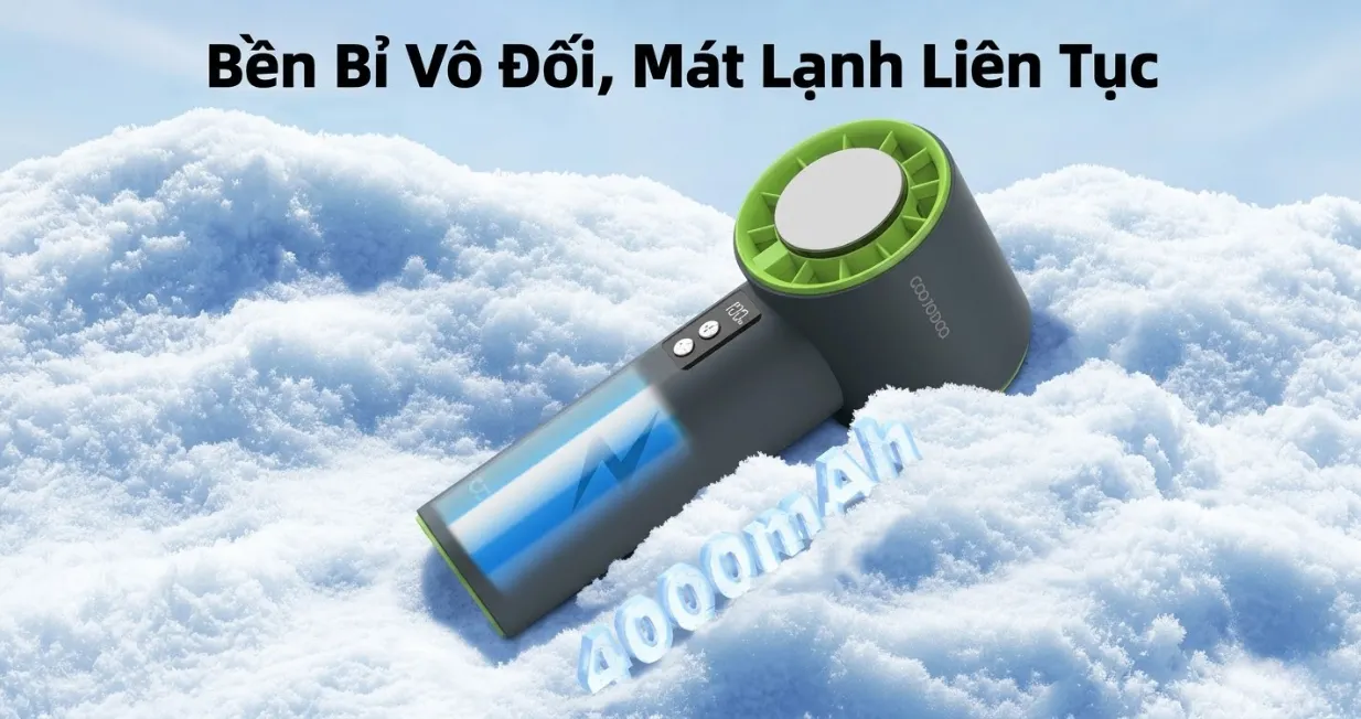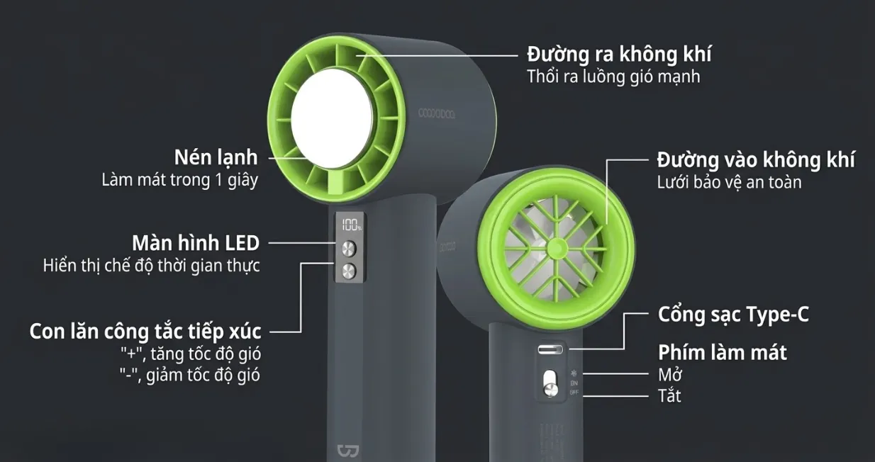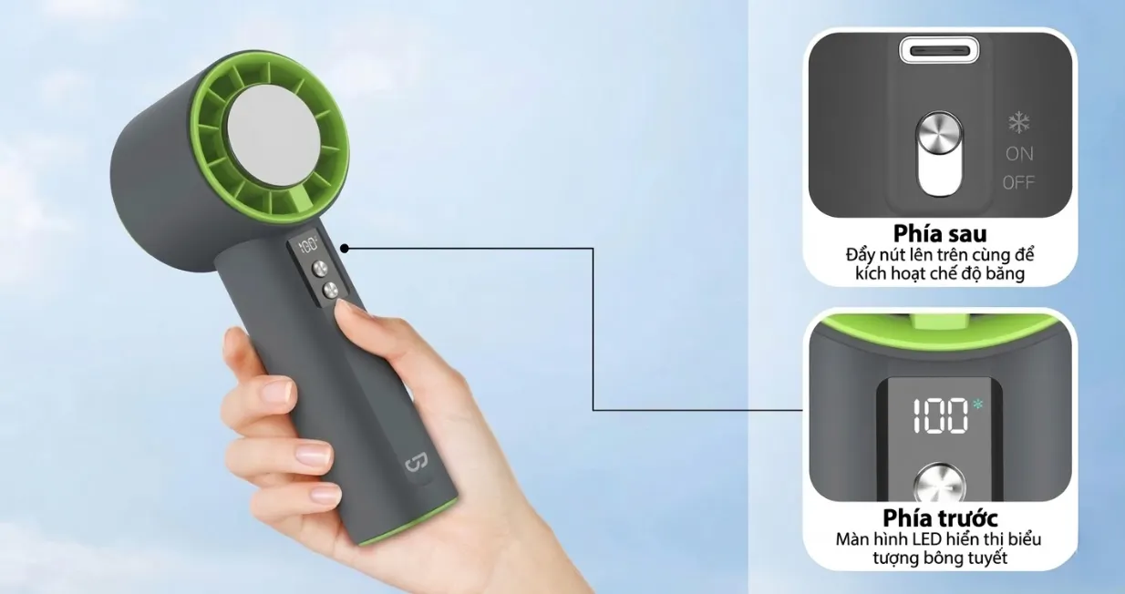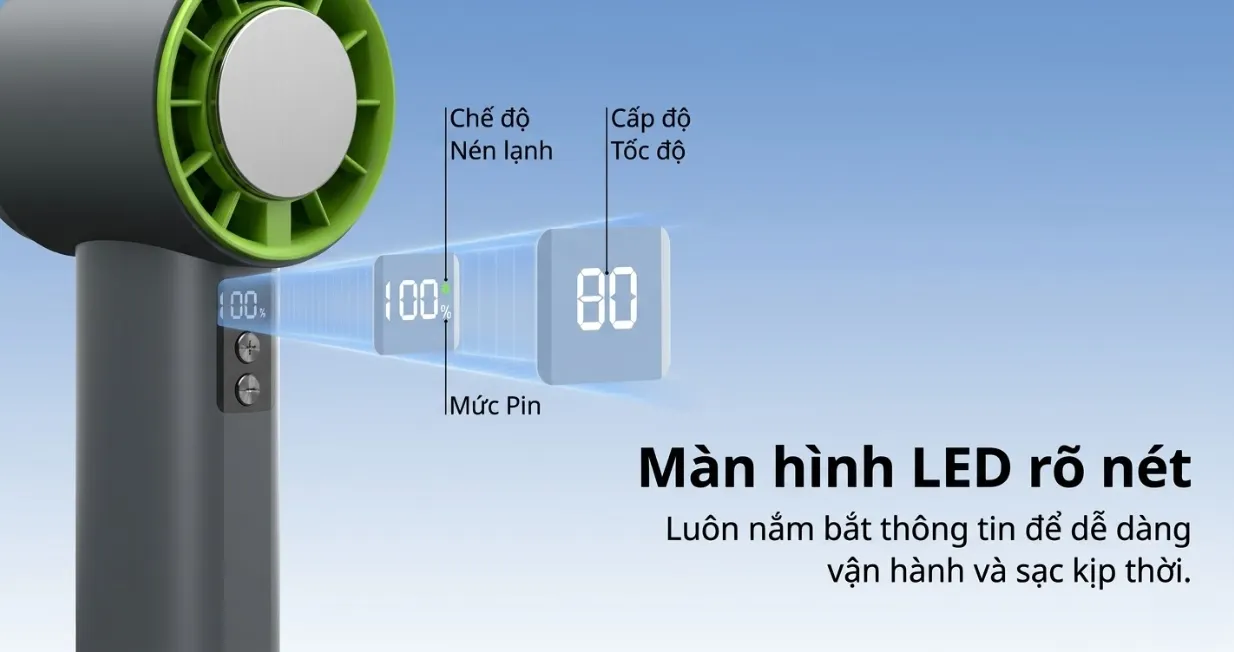 Màn hình LED được tích hợp cho phép quan sát trực tiếp mức pin và tốc độ gió, giúp người dùng thuận tiện điều chỉnh khi sử dụng. Hơn nữa, quạt sở hữu viên pin dung lượng đến 4000mAh, hỗ trợ cổng sạc USB Type-C tiện lợi với thời gian sử dụng 2-12 giờ khi sạc đầy.
