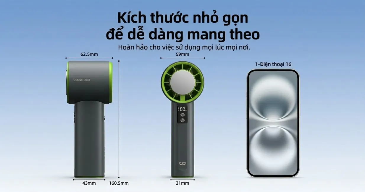 Ngoài ra, thiết bị này có kích thước nhỏ gọn cùng trọng lượng nhẹ. Tông màu trung tính dễ phối với nhiều phong cách cá nhân. Dù là học sinh, sinh viên hay nhân viên văn phòng, đây là sản phẩm phù hợp để làm mát trong những ngày nắng nóng kéo dài.
