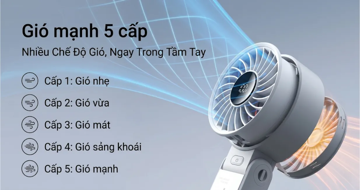 Quạt cầm tay Mini Jisulife Life 7 5000mAh được trang bị công nghệ làm mát hiện đại với 5 tốc độ gió điều chỉnh, đủ để đáp ứng các yêu cầu làm mát cá nhân. Khi kết hợp cùng thời lượng pin lên đến 5000mAh, Mini Jisulife Life 7 có thể hoạt động liên tục đến 19 giờ, cho phép bạn tận hưởng không khí mát lành cả ngày dài.