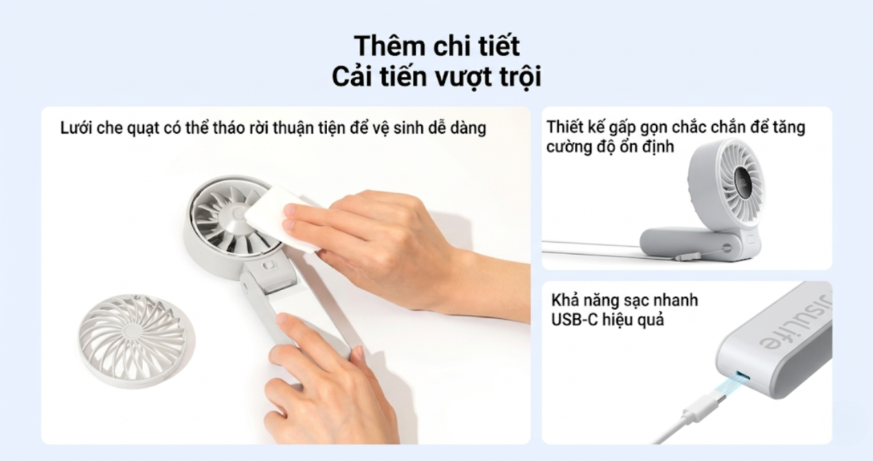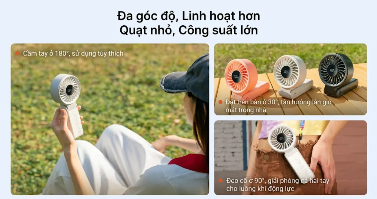 Quạt cầm tay Mini Jisulife Life 7 5000mAh được thiết kế để tối ưu hóa sự tiện lợi và thời trang. Với khả năng gấp gọn, bạn có thể dễ dàng mang theo Mini Jisulife Life 7 trong túi xách hoặc balo tới bất kỳ đâu. Bên cạnh đó, thiết kế đa góc còn cho phép bạn điều chỉnh quạt ở các góc độ khác nhau, từ 30 - 180 độ, cung cấp trải nghiệm làm mát linh hoạt.