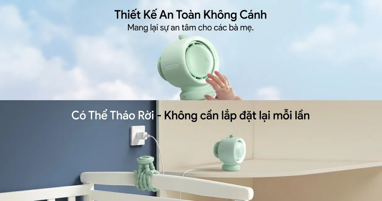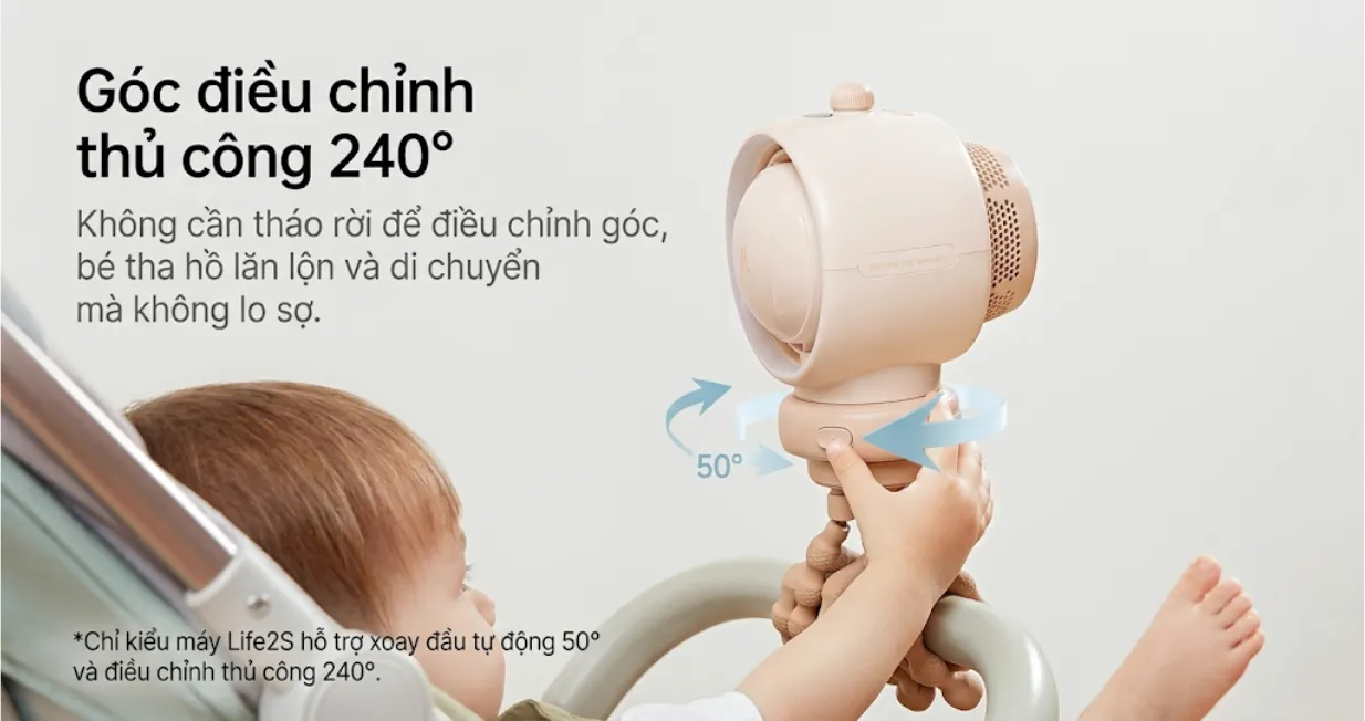 Quạt Jisulife đa năng Life 2S 5000mAh ứng dụng công nghệ turbine không cánh, tăng phạm vi gió thêm 50% và khoảng cách luồng gió gấp đôi so với quạt thông thường. Chân đế silicone đảm bảo an toàn cho trẻ nhỏ, dễ tháo rời để gắn trên xe đẩy hoặc đặt ở nhiều vị trí. Quạt có thiết kế nhỏ gọn, góc xoay thủ công 240°, phù hợp cho phòng khách, phòng ngủ hoặc ngoài trời.