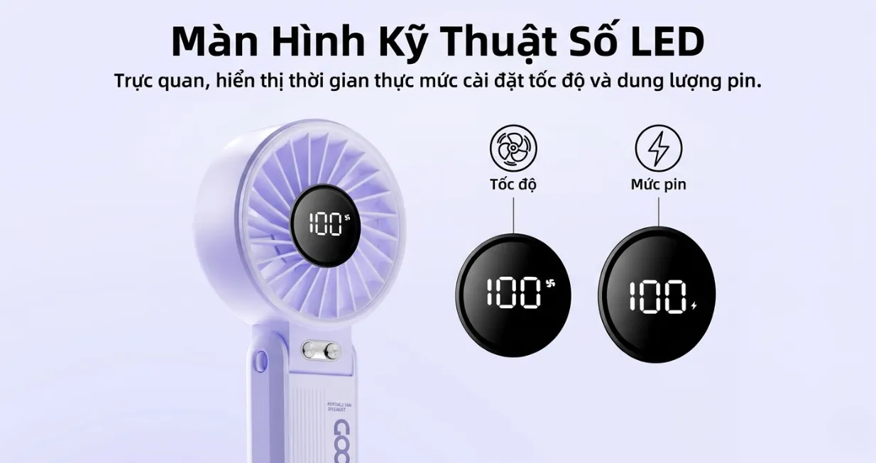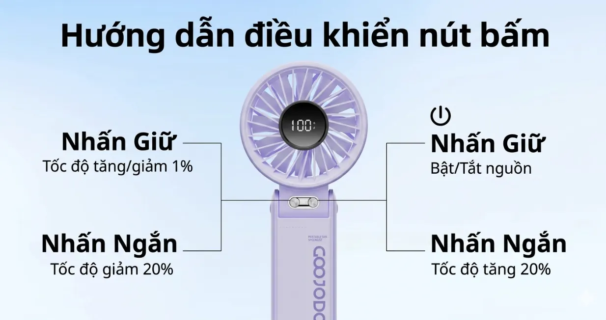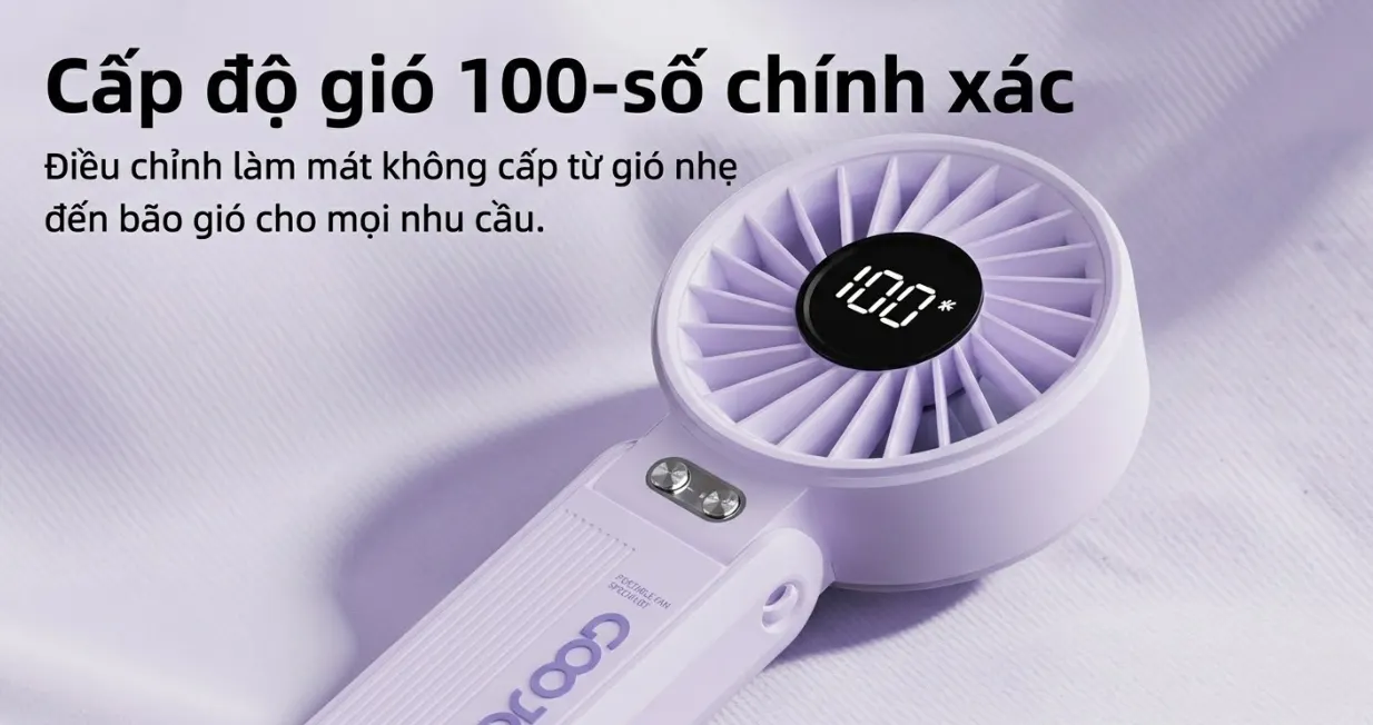 Quạt đa năng mini GOOJODOQ GFS003 hỗ trợ điều chỉnh 100 mức gió linh hoạt, dễ dàng kiểm soát bằng cách giữ nút (+)/(–) để chuyển nhanh 20 mức mỗi lần. Tính năng này mang đến trải nghiệm làm mát cá nhân hóa tối ưu, từ làn gió nhẹ dịu đến luồng không khí mạnh mẽ theo nhu cầu sử dụng.