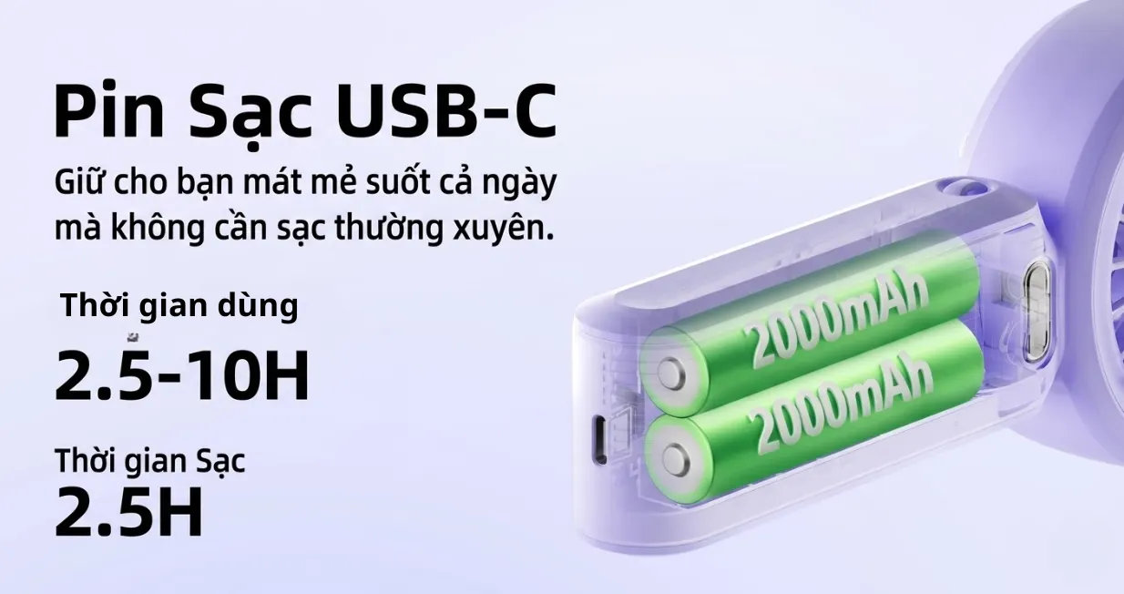 Với viên pin dung lượng lớn, GFS003 có thể hoạt động liên tục suốt nhiều giờ liền, đáp ứng thoải mái cả ngày dài. Quạt cũng hỗ trợ sạc nhanh qua cổng USB Type-C, giúp rút ngắn đáng kể thời gian chờ đợi.