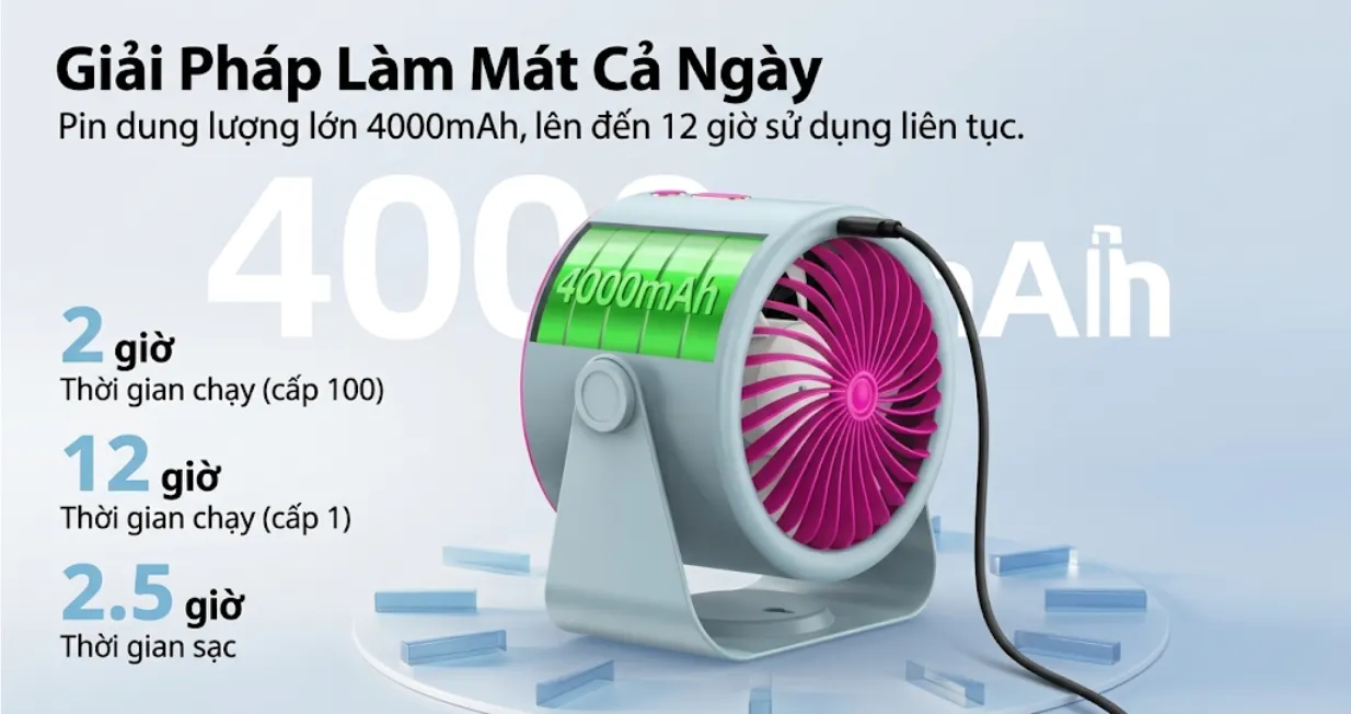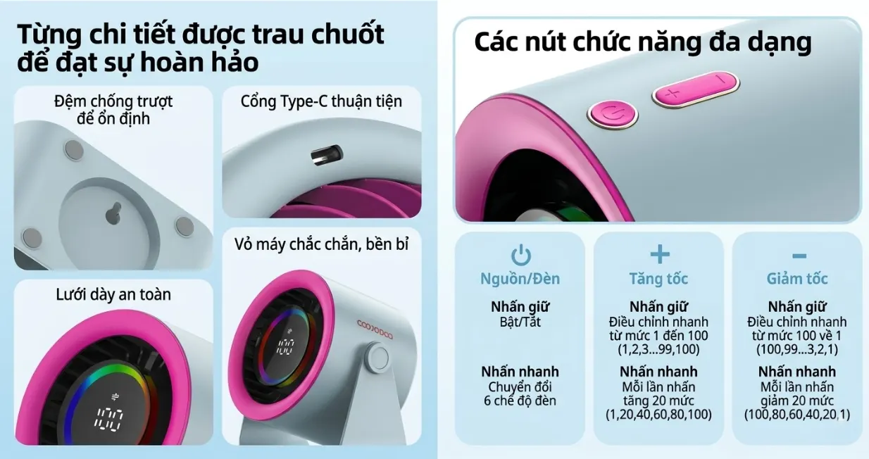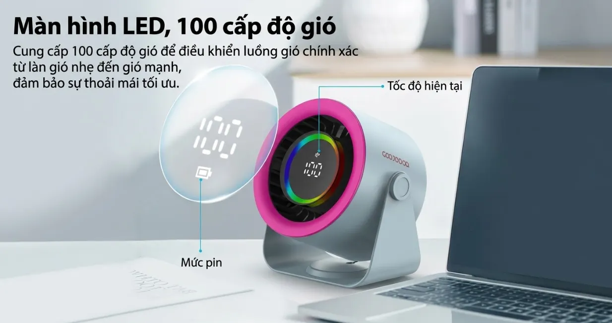 Quạt để bàn mini GOOJODOQ GFS008 được trang bị viên pin 4000mAh dùng 2–12 giờ liên tục, hỗ trợ sạc nhanh chỉ trong 2.5 giờ qua cổng USB-C tiện lợi. Quạt mini để bàn sở hữu động cơ không chổi than hiện đại, 7 cánh quạt lớn và độ ồn chỉ 35dB, mang đến làn gió mạnh nhưng vẫn êm ái. Màn hình LED hiển thị nổi bật với100 mức tốc độ cùng đèn LED đổi màu.
