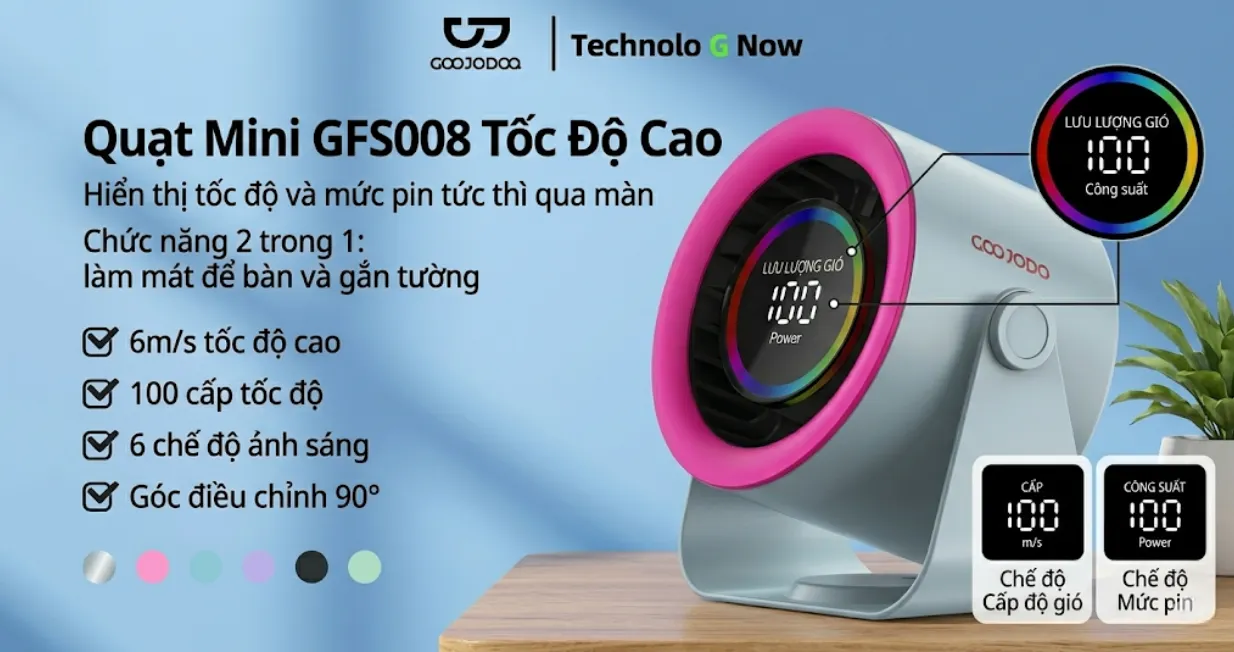 Quạt để bàn mini GOOJODOQ GFS008 mang đến thiết kế nhỏ gọn, vận hành êm và nhiều mức gió tiện lợi. CellphoneS hiện đang có phân phối dòng sản phẩm này với chất lượng chính hãng, bảo hành đầy đủ và hỗ trợ giao hàng nhanh toàn quốc. Khách hàng có thể tuỳ chọn mua trực tuyến hoặc đến cửa hàng CellphoneS để tham khảo. Đây là giải pháp làm mát linh hoạt, đáp ứng tốt nhu cầu sử dụng trong nhiều không gian khác nhau.