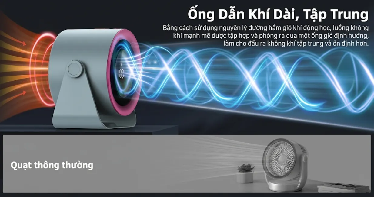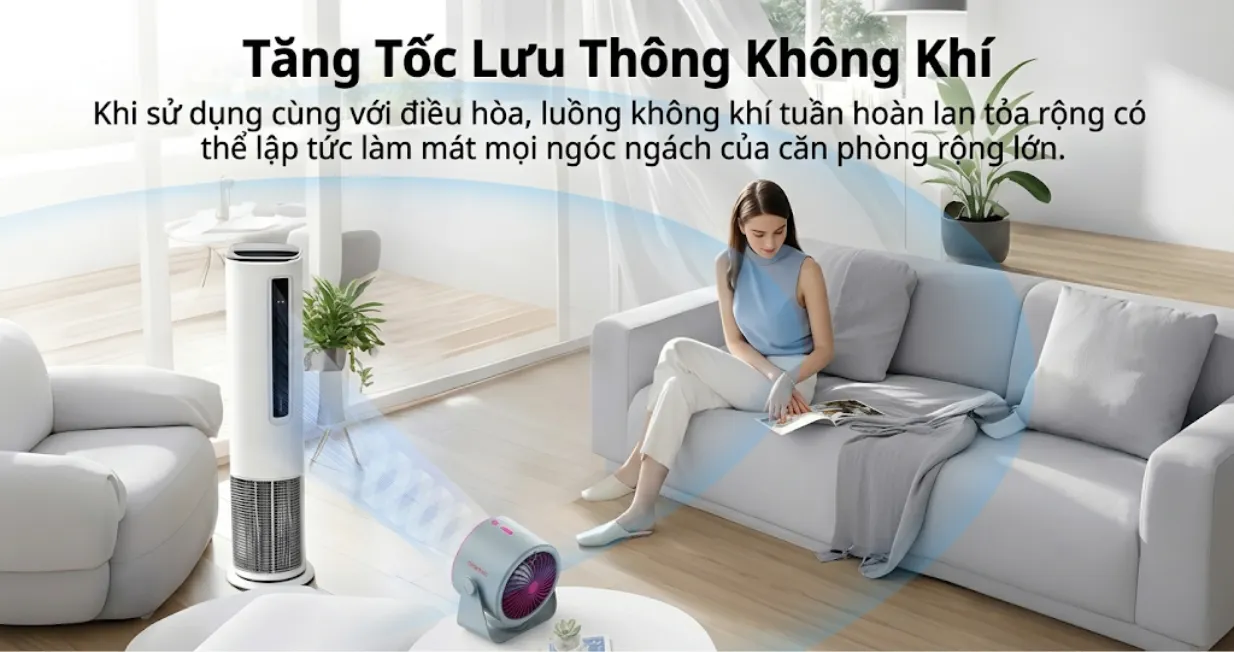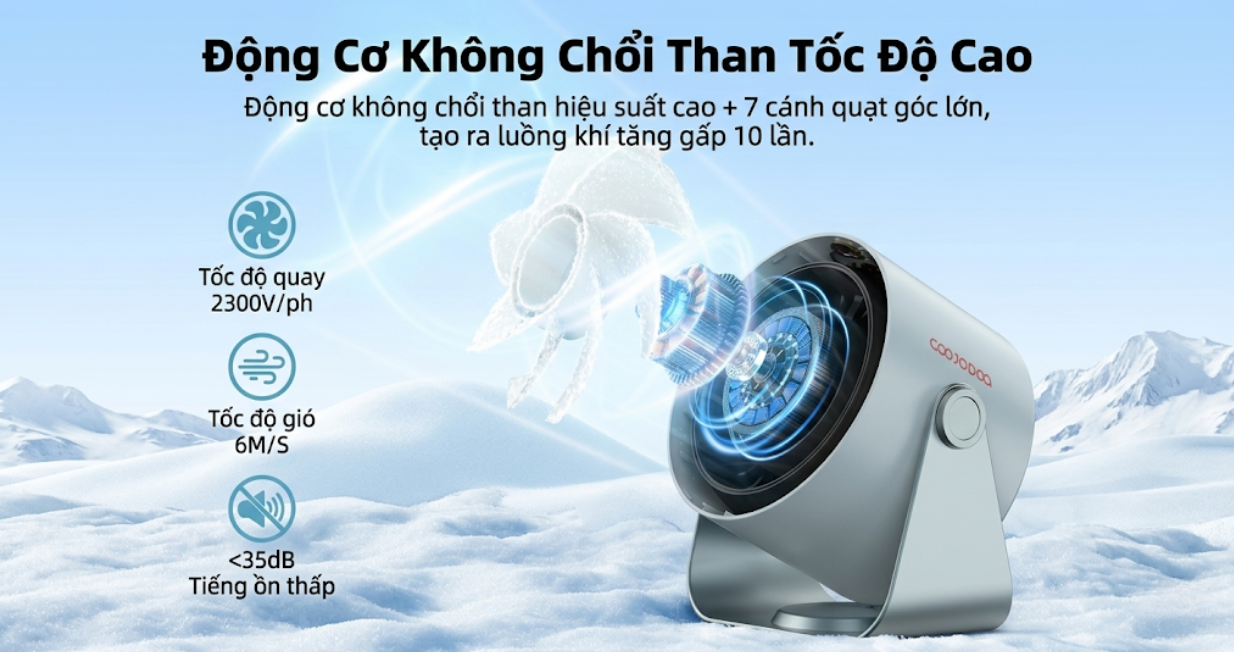 Quạt để bàn mini GOOJODOQ GFS008 sử dụng động cơ không chổi than với tốc độ quay cao, kết hợp 7 cánh quạt nghiêng lớn giúp tạo luồng gió mạnh và ổn định. Khi kết hợp cùng điều hòa, quạt giúp lưu thông không khí hiệu quả hơn, làm mát nhanh khắp căn phòng rộng.