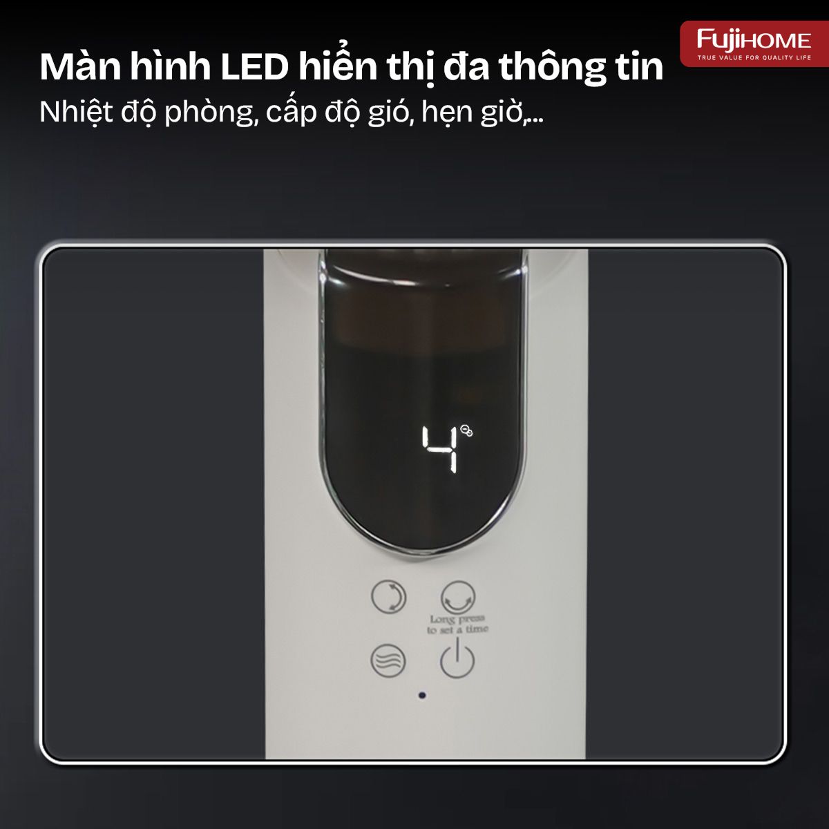 Đặc biệt, thiết bị còn được trang bị màn hình LED sắc nét giúp hiển thị rõ ràng nhiệt độ môi trường, cấp gió, trạng thái hẹn giờ, chế độ hoạt động,... Điều này giúp người dùng dễ dàng quan sát và điều chỉnh chế độ hoạt động của quạt.