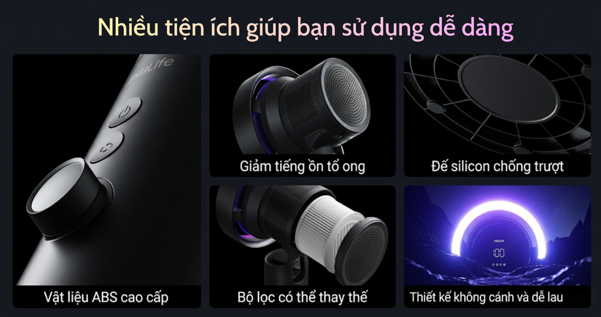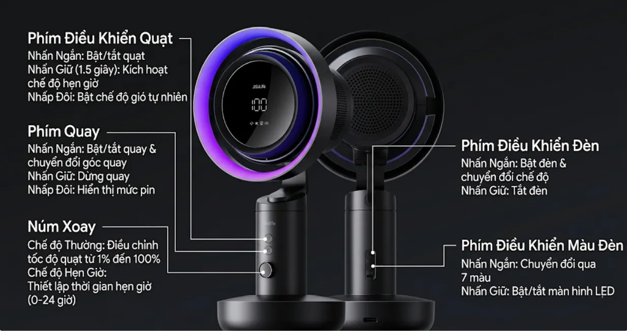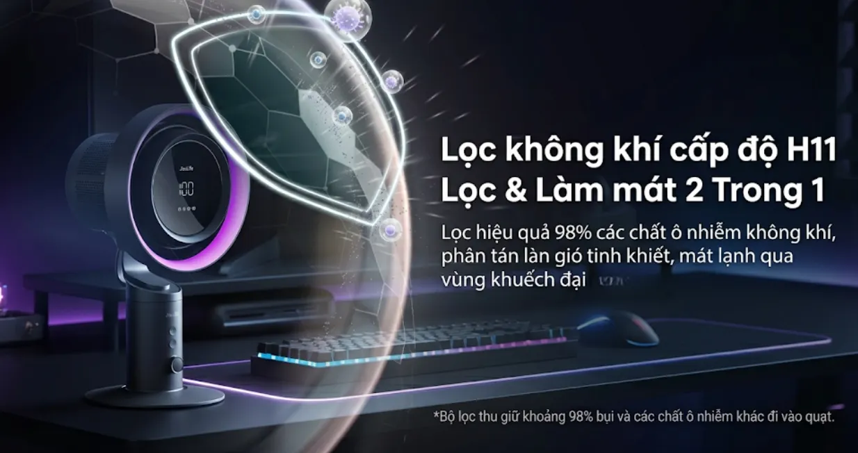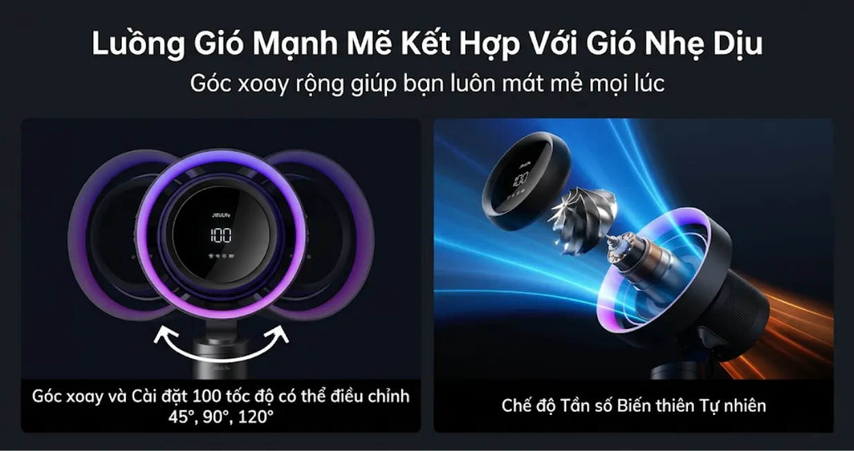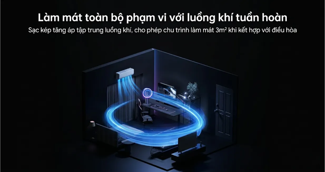 Thêm vào đó, khả năng xoay linh hoạt theo nhiều góc độ cũng cho phép điều chỉnh hướng gió thuận tiện. Không những vậy, quạt còn tích hợp đèn ambient nhiều màu sắc để tăng thêm tính thẩm mỹ.