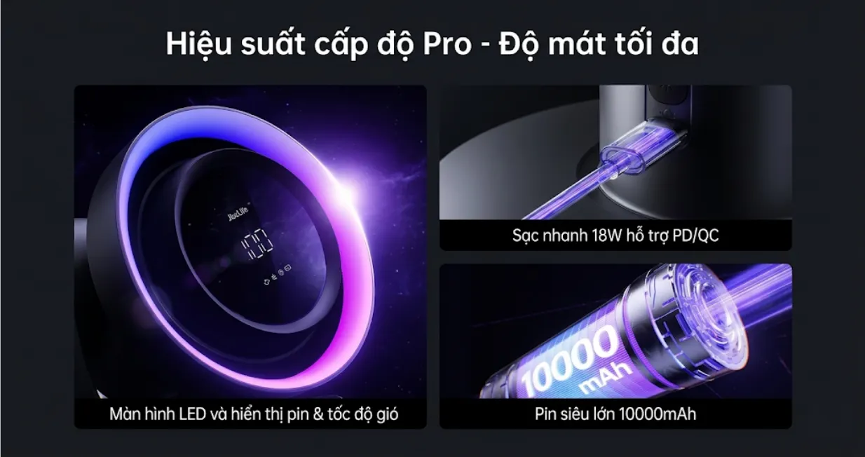 Quạt mini để bàn tích điện JisuLife Table Fan Pro 3 10000mAh sử dụng công nghệ Air Turbo, điều chỉnh lên đến 100 mức gió cùng bộ lọc không khí 11 cấp. Bên cạnh đó, mẫu quạt cầm tay này còn trang bị pin dung lượng tới 10000mAh. Ngoài ra, hệ thống đèn ambient nhiều màu sắc cũng đem đến sự độc đáo khi trải nghiệm.