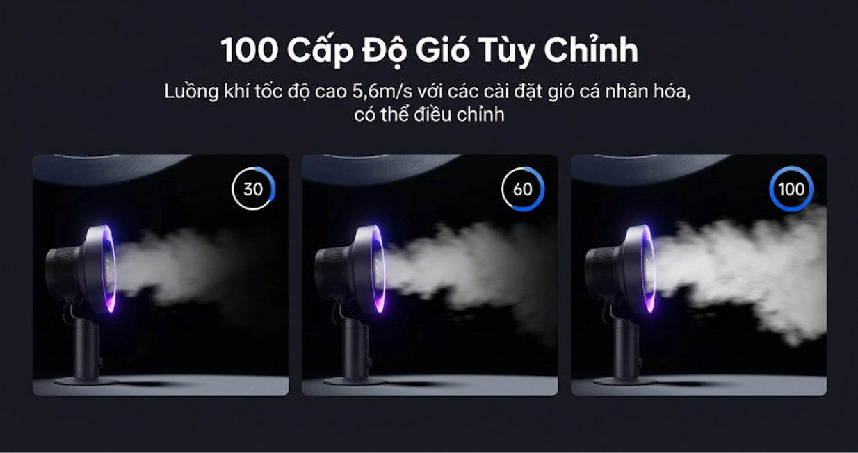 Hơn thế nữa, quạt có thể đạt tốc độ gió lên đến 5.6 m/s, giúp làm mát hiệu quả. Quạt còn cung cấp khả năng điều chỉnh tới 100 mức gió khác nhau. Tùy thuộc vào từng hoàn cảnh, người dùng có thể tinh chỉnh tốc độ gió sao cho phù hợp với nhu cầu.