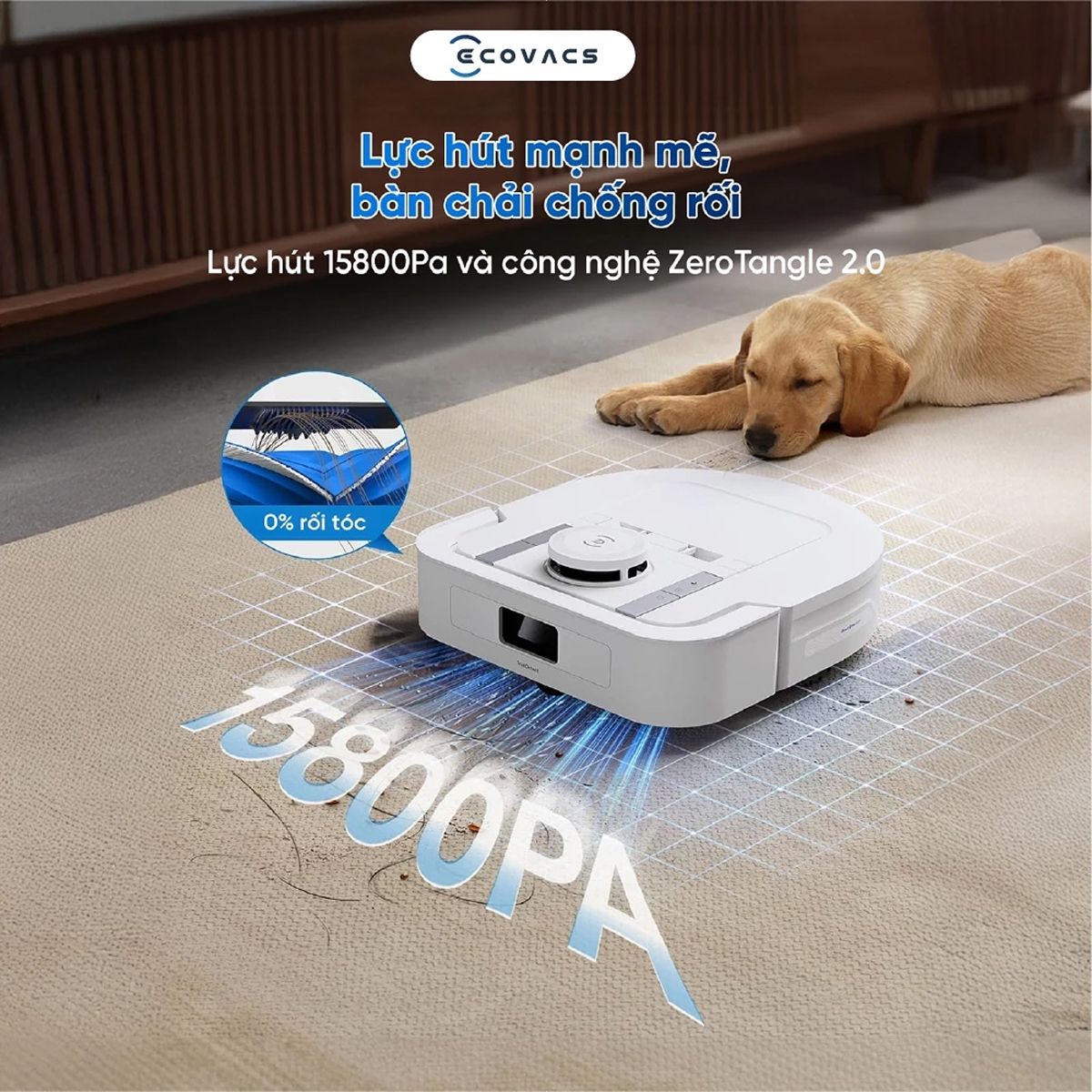 Nhờ sở hữu công nghệ ZeroTangle 2.0, mẫu robot hút bụi Ecovacs này có thể hạn chế tình trạng lông tóc cuốn vào chổi trong quá trình làm sạch. Deebot X5 Hybrid được trang bị lực hút mạnh mẽ lên đến 15.800Pa, đáp ứng hiệu quả nhu cầu vệ sinh chuyên sâu trên nhiều loại bề mặt sàn.
