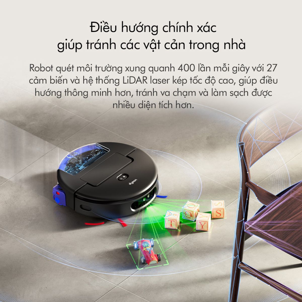 Robot hút bụi lau nhà thông minh Dyson Spot Scrub AI được trang bị lực hút mạnh lên đến 18.000Pa, hỗ trợ làm sạch hiệu quả trên nhiều bề mặt khác nhau. Thiết bị tích hợp hệ thống AI hỗ trợ nhận diện vết bẩn dễ dàng. Ngoài ra, robot sử dụng 27 cảm biến kết hợp LiDAR laser kép, hỗ trợ thiết bị tránh vật cản linh hoạt.