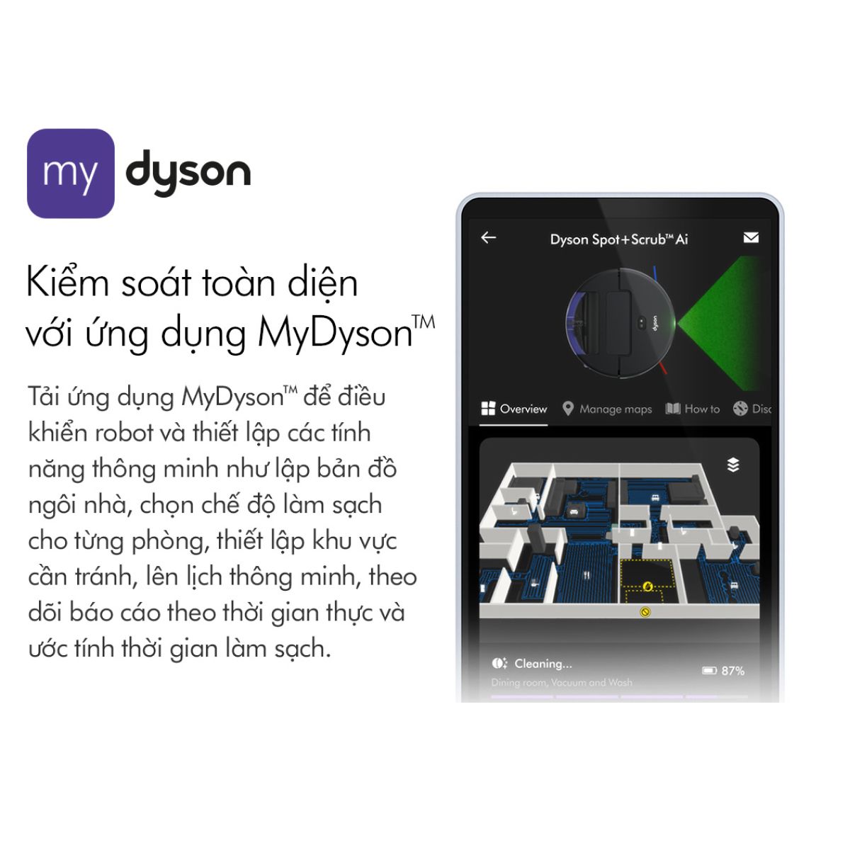 robot hút bụi lau nhà thông minh Dyson Spot Scrub AI hỗ trợ kết nối với ứng dụng MyDyson™, cho phép người dùng tùy chỉnh khu vực dọn dẹp trực tiếp trên điện thoại. Thông qua ứng dụng, việc kiểm soát thiết bị trở nên thuận tiện hơn, phù hợp với nhu cầu quản lý từ xa trong cuộc sống hiện đại.