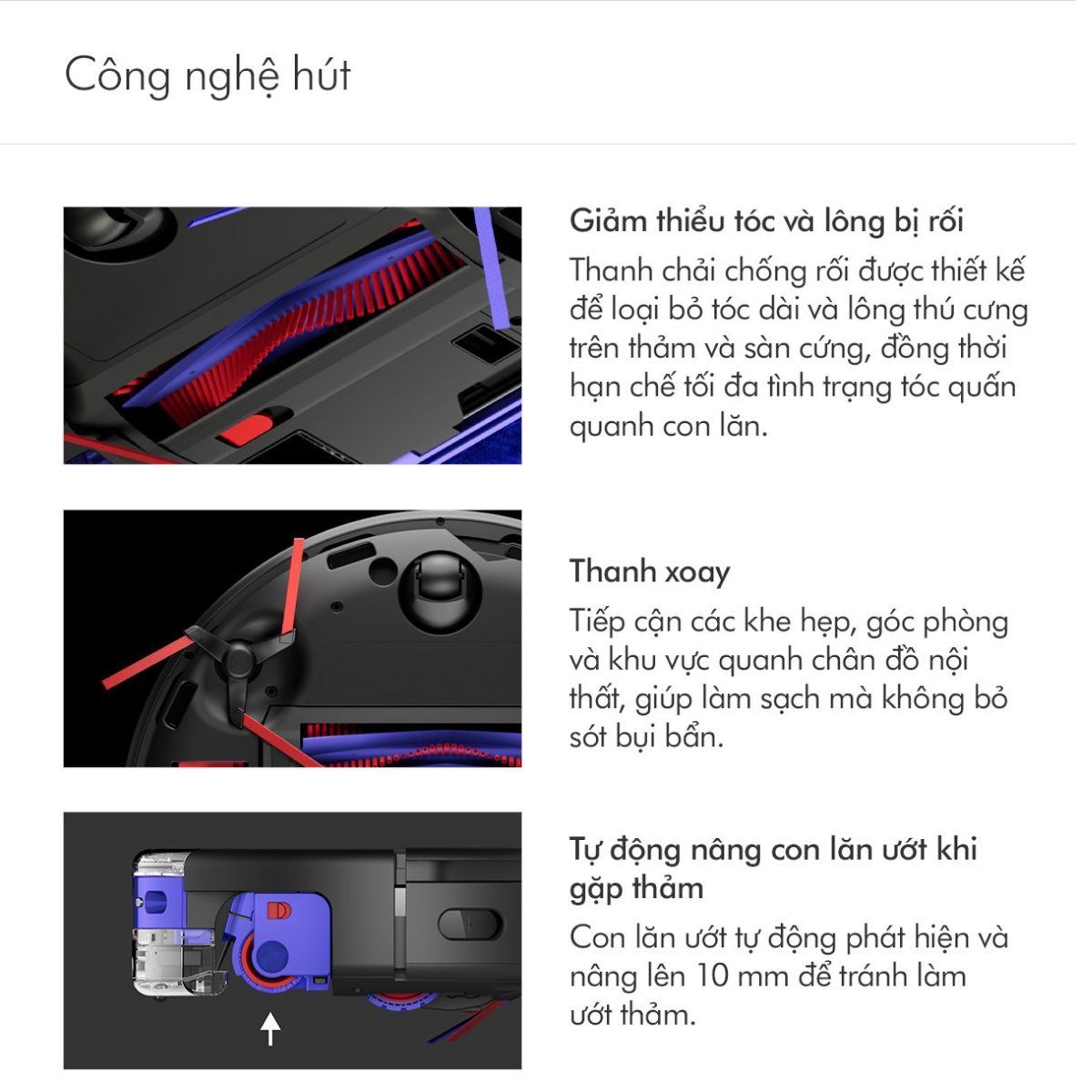 | Tính năng | Hỗ trợ lau nhà, Điều khiển qua ứng dụng, Tự động quay về đế sạc, Tự động điều chỉnh sức hút, Tự động hút bụi, Tự động giặt giẻ, Tự động sấy giẻ |