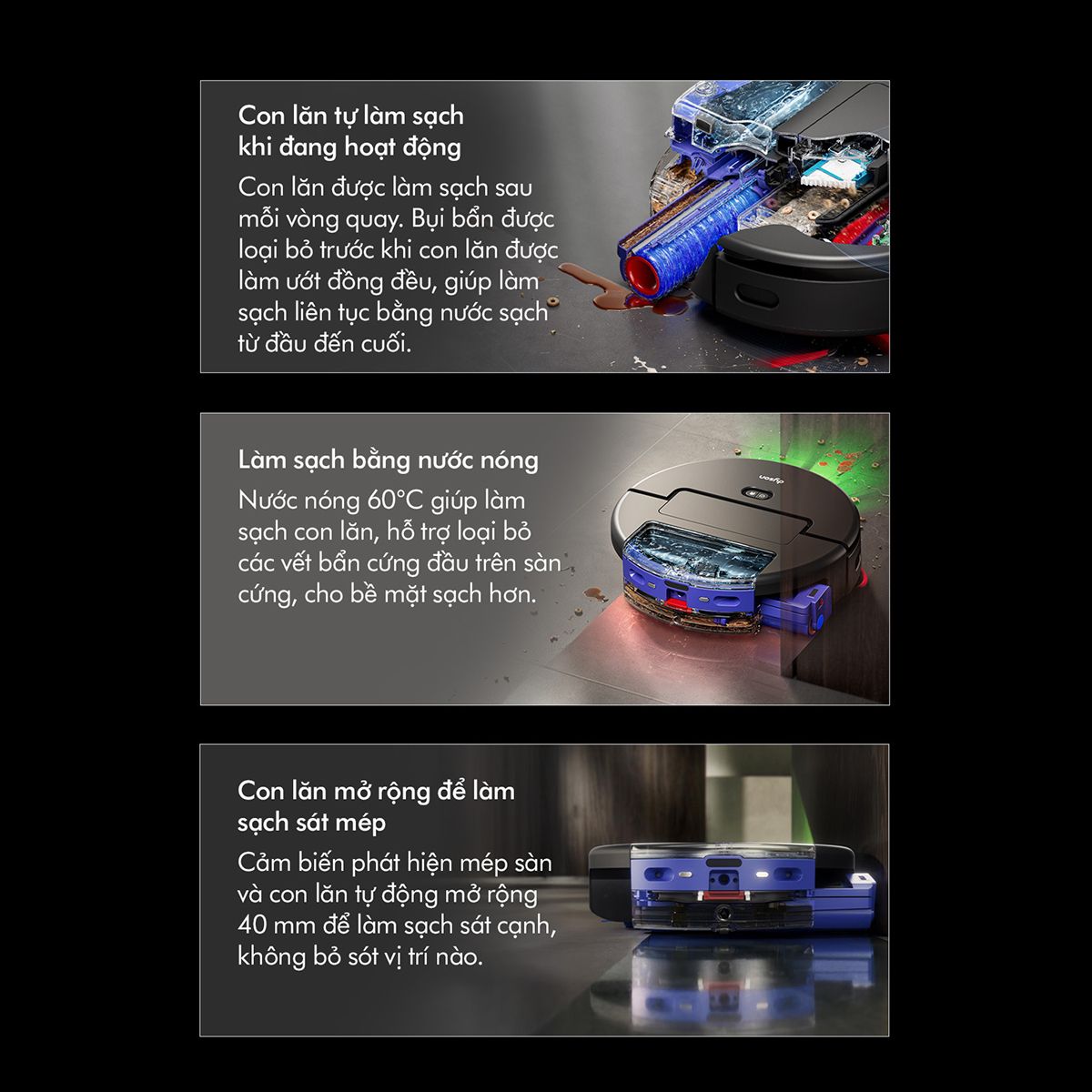 Bên cạnh đó, robot còn tích hợp khả năng làm sạch con lăn bằng nước nóng 60°C, hỗ trợ loại bỏ vết bẩn cứng đầu và duy trì hiệu quả vệ sinh ổn định. Khi di chuyển trên thảm, con lăn ướt có thể nâng lên khoảng 10mm nhằm hạn chế làm ướt bề mặt, từ đó giúp thiết bị vận hành linh hoạt trên nhiều loại sàn khác nhau.