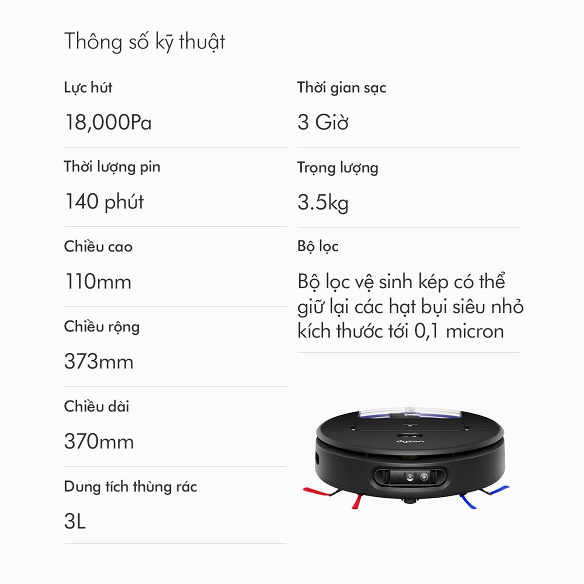 Robot hút bụi lau nhà thông minh Dyson Spot Scrub AI được trang bị lực hút mạnh lên đến 18.000Pa, giúp xử lý hiệu quả các mảnh vụn, bụi mịn trên nhiều bề mặt. Dung tích khoang chứa bụi lên đến 3 lít chứa được lượng rác lớn enne người dùng không cần phải đổ rác thường xuyên, phù hợp để vệ sinh các không gian rộng lớn.