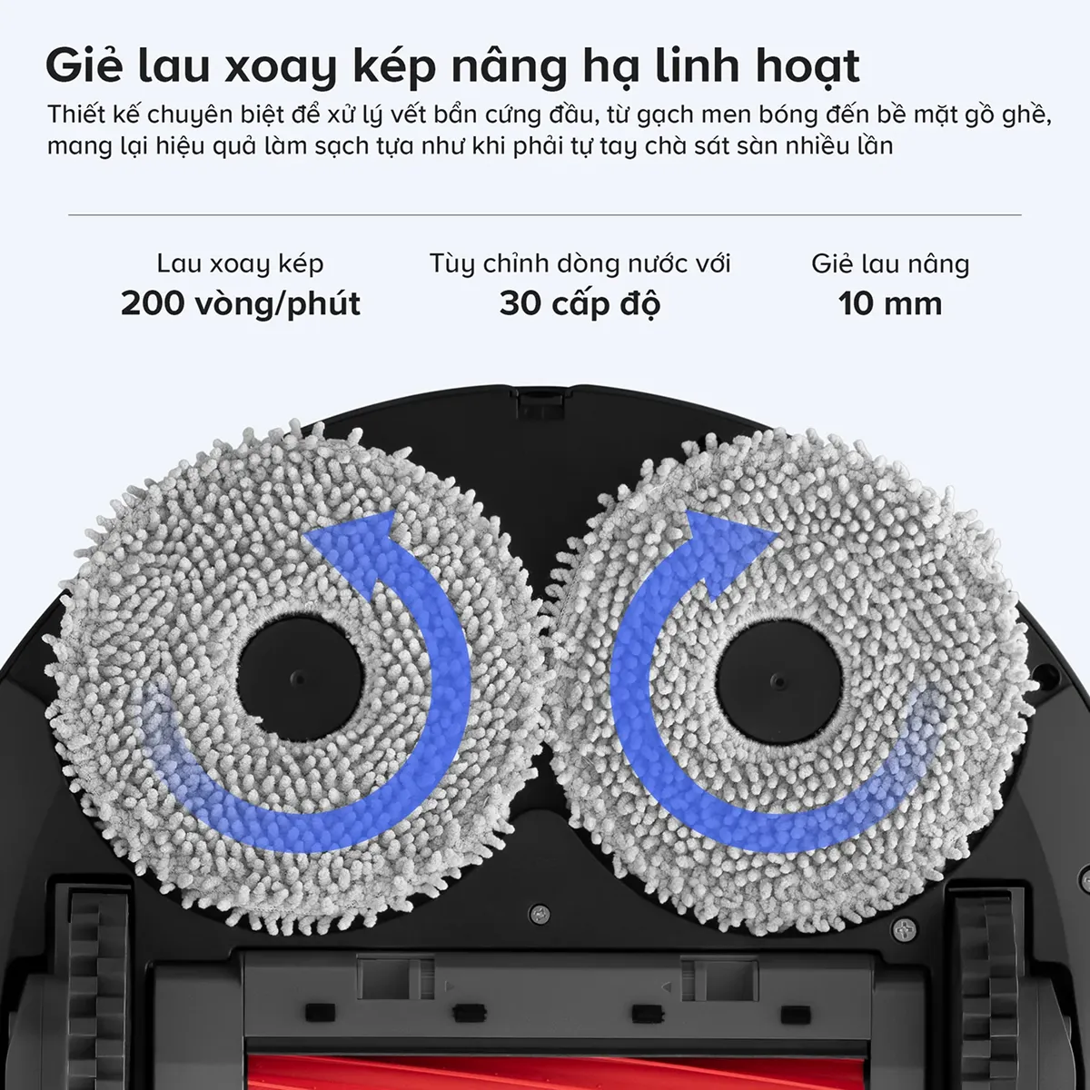 Khả năng lau nhà của robot hút bụi Roborock S Pro cực kỳ nổi bật nhờ cơ chế giẻ xoay kép đạt tốc độ 200 vòng/phút kết hợp tính năng nâng giẻ. Bên cạnh đó, người dùng có thể linh hoạt tùy chỉnh lưu lượng dòng nước tới 30 cấp độ nhằm xử lý triệt để nhiều loại vết bẩn cứng đầu.