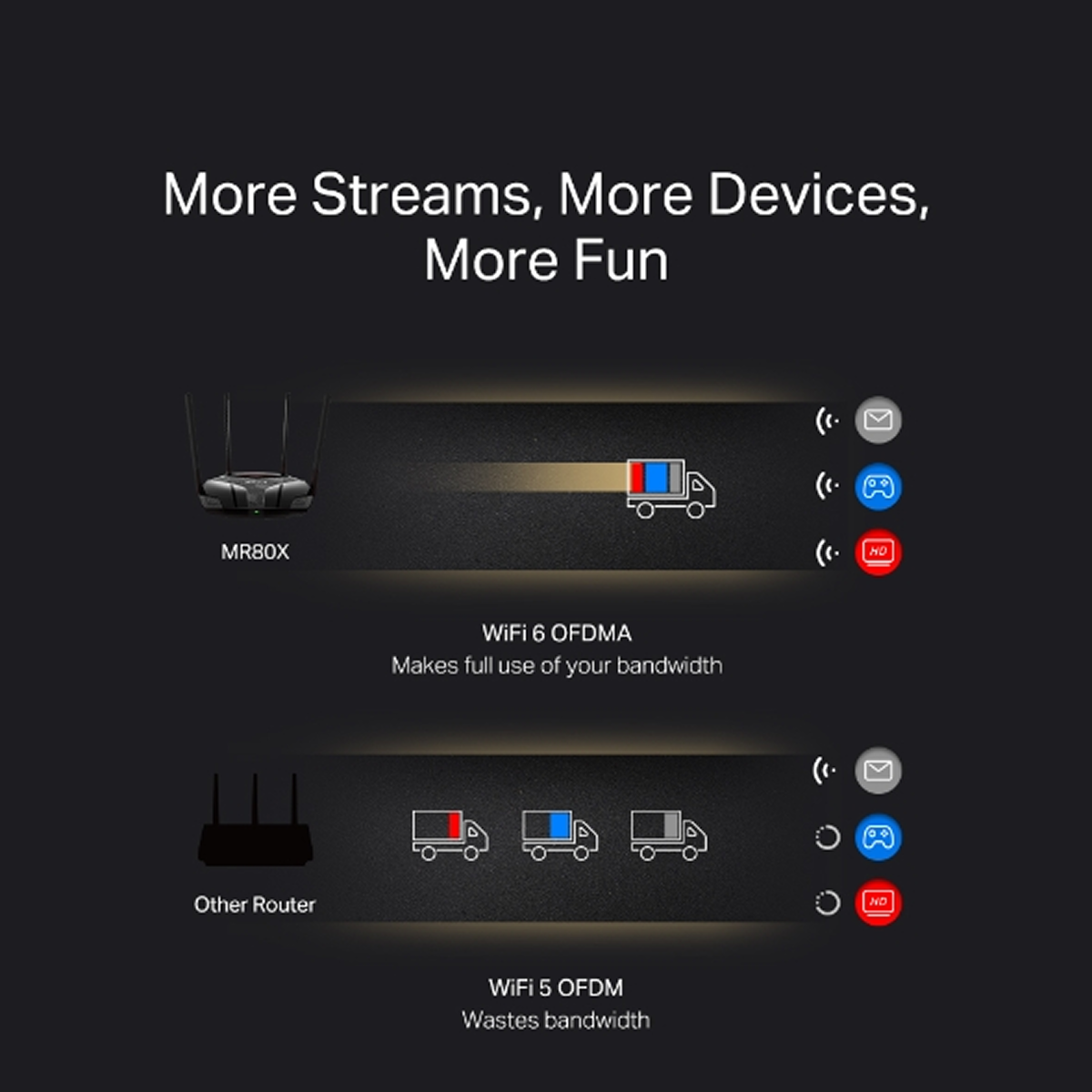 Bên cạnh đó, router WiFi 6 Mercusys MR80X AX3000 còn áp dụng công nghệ MU-MIMO, hỗ trợ lượng lớn truy cập đồng thời mà không làm hạn chế độ tổng thể. Cùng với OFDMA (Orthogonal Frequency Division Multiple Access), dữ liệu được phân chia thành các gói nhỏ hơn.