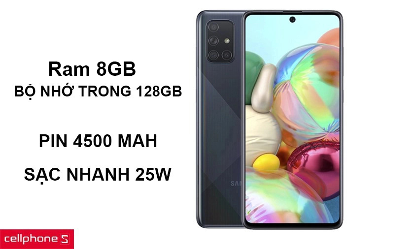 Samsung A71 được trang bị bộ nhớ RAM khổng lồ 8GB giúp tăng tốc độ xử lý của điện thoại. Bộ nhớ trong của máy lên đến 128GB và để có thêm dung lượng lưu trữ, có một khe chuyên dụng để hỗ trợ thẻ nhớ microSD lên tới 512 GB. Đây là dung lượng lưu trữ dồi dào để giữ tất cả dữ liệu bạn cần trên A71.