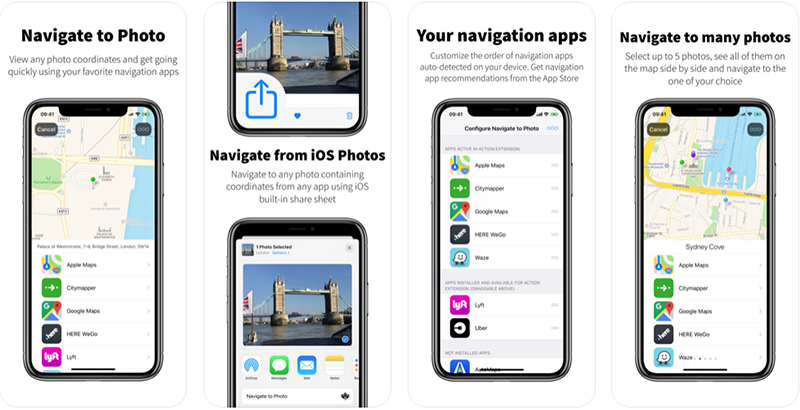 0,99 USD Free / 214 Ratings/ App Store USỨng dụng chỉ đường dựa trên dữ liệu vị trí của ảnh chụp, có thể hoạt động tốt với Apple Maps - AutoMapa - Citymapper - Gaia GPS - Guru Maps (Galileo Offline Maps) - Garmin U.S. - Google Maps - HERE WeGo - iGo primo - Lyft - Maps.me - MotionX GPS - MotionX GPS Drive - MotionX GPS HD - NAVIGON - Navmii GPS (Navfree GPS) - Pocket Earth - Scout Navigation - Sygic Navigation - TomTom (only pre-GO Mobile versions are supported) - Transit App - Uber - Waze - Yandex.Navigator.