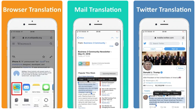 Ứng dụng dịch thuật chuyên nghiệp với khả năng dịch trên 40 ngôn ngữ khác nhau, giúp bạn dễ dàng giao tiếp với chỉ một vài thao tác. Ứng dụng có một số tính năng đặc biệt như chia sẻ trực tiếp kết quả qua email hoặc mạng xã hội, chuyển văn bản ký tự sang giọng nói…Các bạn có thể tải Translator app free tại đây.